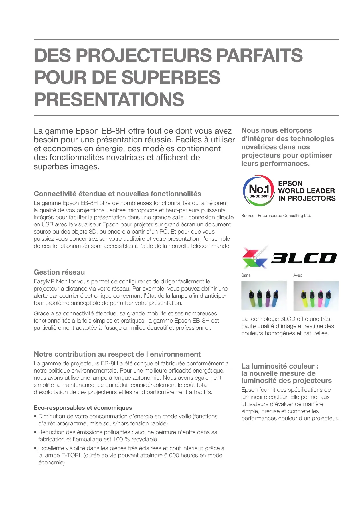 PRESENTATIONS La gamme Epson EB-8H offre tout ce dont vous avez besoin pour une présentation réussie. Faciles à utiliser et économes en énergie, ces modèles contiennent des fonctionnalités novatrices et affichent de superbes images. Nous nous efforçons d'intégrer des technologies novatrices dans nos projecteurs pour optimiser leurs performances. Connectivité étendue et nouvelles fonctionnalités La gamme Epson EB-8H offre de nombreuses fonctionnalités qui améliorent la qualité de vos projections : entrée microphone et haut-parleurs puissants intégrés pour faciliter la présentation dans une grande salle ; connexion directe en USB avec le visualiseur Epson pour projeter sur grand écran un document source ou des objets 3D, ou encore à partir d'un PC. Et pour que vous puissiez vous concentrez sur votre auditoire et votre présentation, l'ensemble de ces fonctionnalités sont accessibles à l'aide de la nouvelle télécommande. Gestion réseau Source : Futuresource Consulting Ltd. Sans Avec EasyMP Monitor vous permet de configurer et de diriger facilement le projecteur à distance via votre réseau. Par exemple, vous pouvez définir une alerte par courrier électronique concernant l'état de la lampe afin d'anticiper tout problème susceptible de perturber votre présentation. Grâce à sa connectivité étendue, sa grande mobilité et ses nombreuses fonctionnalités à la fois simples et pratiques, la gamme Epson EB-8H est particulièrement adaptée à l'usage en milieu éducatif et professionnel. La technologie 3LCD offre une très haute qualité d'image et restitue des couleurs homogènes et naturelles. Notre contribution au respect de l'environnement La gamme de projecteurs EB-8H a été conçue et fabriquée conformément à notre politique environnementale. Pour une meilleure efficacité énergétique, nous avons utilisé une lampe à longue autonomie. Nous avons également simplifié la maintenance, ce qui réduit considérablement le coût total d'exploitation de ces projecteurs et les rend particulièrement attractifs. Eco-responsables et économiques