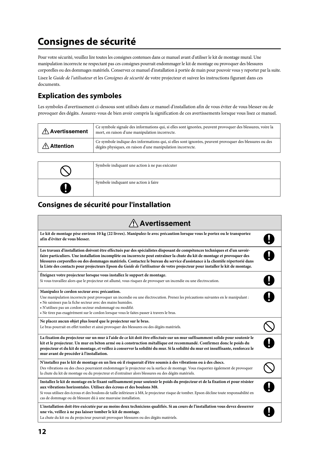• Ne tirez pas exagérément sur le cordon lorsque vous le faites passer à travers le bras. Ne placez aucun objet plus lourd que le projecteur sur le bras. Le bras pourrait en effet tomber et ainsi provoquer des blessures ou des dégâts matériels. La fixation du projecteur sur un mur à l'aide de ce kit doit être effectuée sur un mur suffisamment solide pour soutenir le kit et le projecteur. Un mur en béton armé ou à construction métallique est recommandé. Confirmez donc le poids du projecteur et du kit de montage, et veillez à conserver la solidité du mur. Si la solidité du mur est insuffisante, renforcez le mur avant de procéder à l'installation. N'installez pas le kit de montage en un lieu où il risquerait d'être soumis à des vibrations ou à des chocs. Des vibrations ou des chocs pourraient endommager le projecteur ou la surface de montage. Vous risqueriez également de provoquer la chute du kit de montage ou du projecteur et d'entraîner alors blessures ou des dégâts matériels. Installez le kit de montage en le fixant suffisamment pour soutenir le poids du projecteur et de la fixation et pour résister aux vibrations horizontales. Utilisez des écrous et des boulons M8. Si vous utilisez des écrous et des boulons de taille inférieure à M8, le projecteur risque de tomber. Epson décline toute responsabilité en cas de dommage ou de blessure dû à une mauvaise installation. L'installation doit être exécutée par au moins deux techniciens qualifiés. Si au cours de l'installation vous devez desserrer une vis, veillez à ne pas laisser tomber le kit de montage. La chute du kit ou du projecteur pourrait provoquer blessures ou des dégâts matériels.