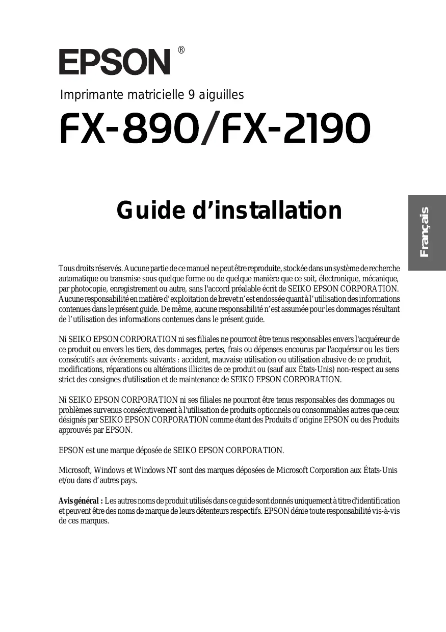 'HXWVFK Guide d’installation Tous droits réservés. Aucune partie de ce manuel ne peut être reproduite, stockée dans un système de recherche automatique ou transmise sous quelque forme ou de quelque manière que ce soit, électronique, mécanique, par photocopie, enregistrement ou autre, sans l'accord préalable écrit de SEIKO EPSON CORPORATION. Aucune responsabilité en matière d’exploitation de brevet n’est endossée quant à l’utilisation des informations contenues dans le présent guide. De même, aucune responsabilité n’est assumée pour les dommages résultant de l’utilisation des informations contenues dans le présent guide. Ni SEIKO EPSON CORPORATION ni ses filiales ne pourront être tenus responsables envers l'acquéreur de ce produit ou envers les tiers, des dommages, pertes, frais ou dépenses encourus par l'acquéreur ou les tiers consécutifs aux événements suivants : accident, mauvaise utilisation ou utilisation abusive de ce produit, modifications, réparations ou altérations illicites de ce produit ou (sauf aux États-Unis) non-respect au sens strict des consignes d'utilisation et de maintenance de SEIKO EPSON CORPORATION. Ni SEIKO EPSON CORPORATION ni ses filiales ne pourront être tenus responsables des dommages ou problèmes survenus consécutivement à l'utilisation de produits optionnels ou consommables autres que ceux désignés par SEIKO EPSON CORPORATION comme étant des Produits d’origine EPSON ou des Produits approuvés par EPSON. EPSON est une marque déposée de SEIKO EPSON CORPORATION. Microsoft, Windows et Windows NT sont des marques déposées de Microsoft Corporation aux États-Unis et/ou dans d’autres pays. Avis général : Les autres noms de produit utilisés dans ce guide sont donnés uniquement à titre d'identification et peuvent être des noms de marque de leurs détenteurs respectifs. EPSON dénie toute responsabilité vis-à-vis de ces marques. Français Imprimante matricielle 9 aiguilles