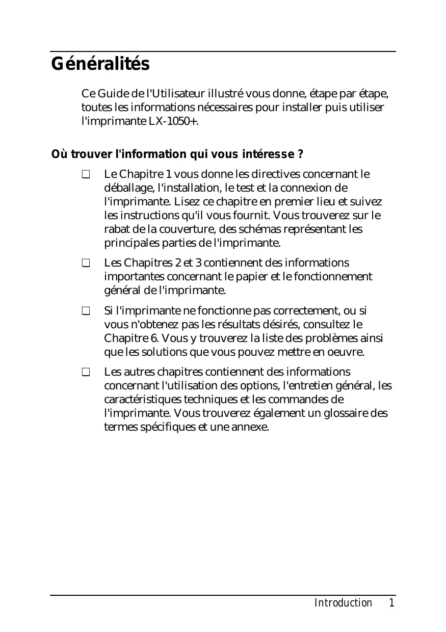 Généralités Ce Guide de l'Utilisateur illustré vous donne, étape par étape, toutes les informations nécessaires pour installer puis utiliser l'imprimante LX-1050+. Où trouver l'information qui vous intéresse ?
