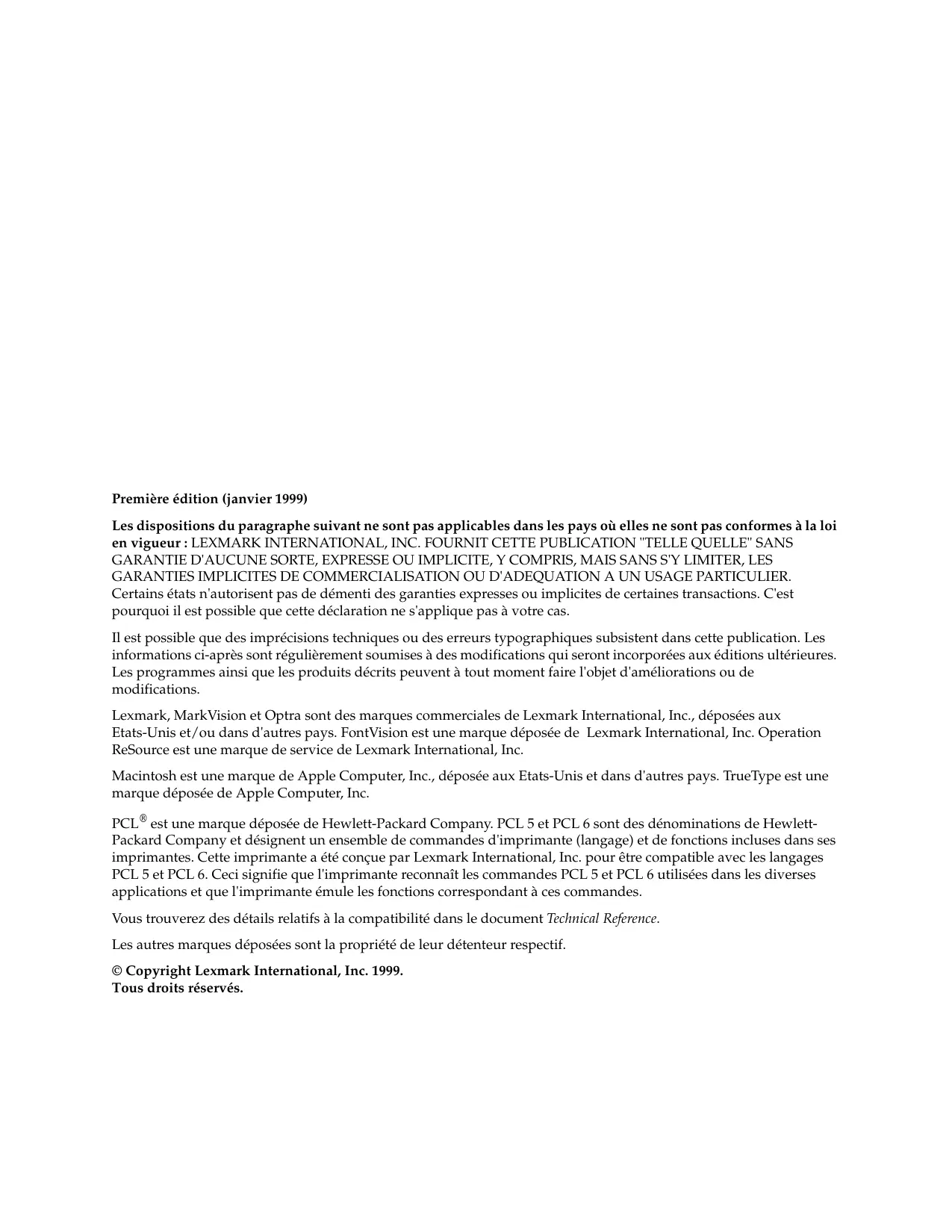 Première édition (janvier 1999) Les dispositions du paragraphe suivant ne sont pas applicables dans les pays où elles ne sont pas conformes à la loi en vigueur : LEXMARK INTERNATIONAL, INC. FOURNIT CETTE PUBLICATION "TELLE QUELLE" SANS GARANTIE D'AUCUNE SORTE, EXPRESSE OU IMPLICITE, Y COMPRIS, MAIS SANS S'Y LIMITER, LES GARANTIES IMPLICITES DE COMMERCIALISATION OU D'ADEQUATION A UN USAGE PARTICULIER. Certains états n'autorisent pas de démenti des garanties expresses ou implicites de certaines transactions. C'est pourquoi il est possible que cette déclaration ne s'applique pas à votre cas. Il est possible que des imprécisions techniques ou des erreurs typographiques subsistent dans cette publication. Les informations ci-après sont régulièrement soumises à des modifications qui seront incorporées aux éditions ultérieures. Les programmes ainsi que les produits décrits peuvent à tout moment faire l'objet d'améliorations ou de modifications. Lexmark, MarkVision et Optra sont des marques commerciales de Lexmark International, Inc., déposées aux Etats-Unis et/ou dans d'autres pays. FontVision est une marque déposée de Lexmark International, Inc. Operation ReSource est une marque de service de Lexmark International, Inc. Macintosh est une marque de Apple Computer, Inc., déposée aux Etats-Unis et dans d'autres pays. TrueType est une marque déposée de Apple Computer, Inc. PCL® est une marque déposée de Hewlett-Packard Company. PCL 5 et PCL 6 sont des dénominations de HewlettPackard Company et désignent un ensemble de commandes d'imprimante (langage) et de fonctions incluses dans ses imprimantes. Cette imprimante a été conçue par Lexmark International, Inc. pour être compatible avec les langages PCL 5 et PCL 6. Ceci signifie que l'imprimante reconnaît les commandes PCL 5 et PCL 6 utilisées dans les diverses applications et que l'imprimante émule les fonctions correspondant à ces commandes. Vous trouverez des détails relatifs à la compatibilité dans le document Technical Reference. Les autres marques déposées sont la propriété de leur détenteur respectif. © Copyright Lexmark International, Inc. 1999. Tous droits réservés. Table des matières