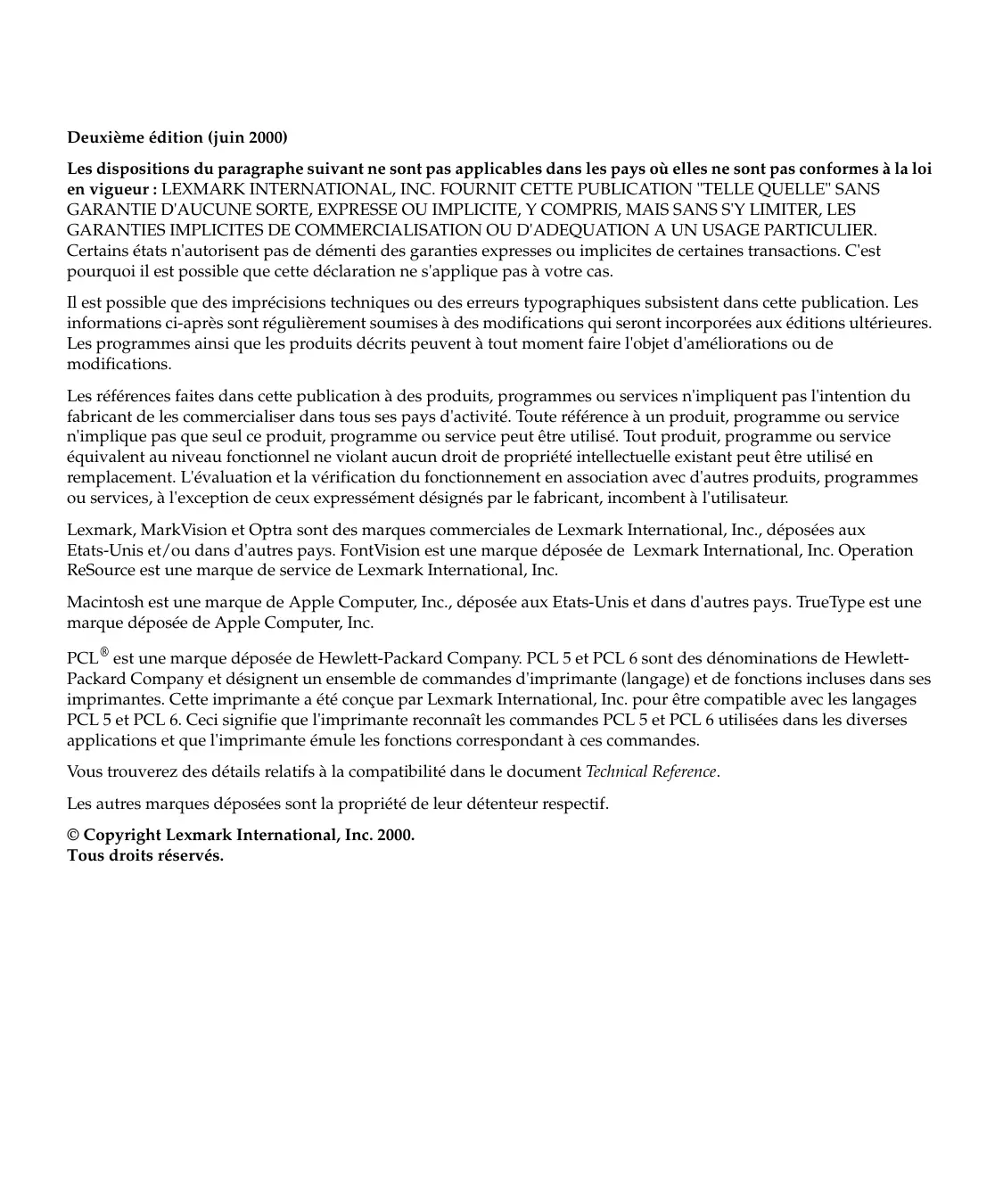 Optra E312/L Juin 2000 www.lexmark.com Deuxième édition (juin 2000) Les dispositions du paragraphe suivant ne sont pas applicables dans les pays où elles ne sont pas conformes à la loi en vigueur : LEXMARK INTERNATIONAL, INC. FOURNIT CETTE PUBLICATION "TELLE QUELLE" SANS GARANTIE D'AUCUNE SORTE, EXPRESSE OU IMPLICITE, Y COMPRIS, MAIS SANS S'Y LIMITER, LES GARANTIES IMPLICITES DE COMMERCIALISATION OU D'ADEQUATION A UN USAGE PARTICULIER. Certains états n'autorisent pas de démenti des garanties expresses ou implicites de certaines transactions. C'est pourquoi il est possible que cette déclaration ne s'applique pas à votre cas. Il est possible que des imprécisions techniques ou des erreurs typographiques subsistent dans cette publication. Les informations ci-après sont régulièrement soumises à des modifications qui seront incorporées aux éditions ultérieures. Les programmes ainsi que les produits décrits peuvent à tout moment faire l'objet d'améliorations ou de modifications. Les références faites dans cette publication à des produits, programmes ou services n'impliquent pas l'intention du fabricant de les commercialiser dans tous ses pays d'activité. Toute référence à un produit, programme ou service n'implique pas que seul ce produit, programme ou service peut être utilisé. Tout produit, programme ou service équivalent au niveau fonctionnel ne violant aucun droit de propriété intellectuelle existant peut être utilisé en remplacement. L'évaluation et la vérification du fonctionnement en association avec d'autres produits, programmes ou services, à l'exception de ceux expressément désignés par le fabricant, incombent à l'utilisateur. Lexmark, MarkVision et Optra sont des marques commerciales de Lexmark International, Inc., déposées aux Etats-Unis et/ou dans d'autres pays. FontVision est une marque déposée de Lexmark International, Inc. Operation ReSource est une marque de service de Lexmark International, Inc. Macintosh est une marque de Apple Computer, Inc., déposée aux Etats-Unis et dans d'autres pays. TrueType est une marque déposée de Apple Computer, Inc. PCL® est une marque déposée de Hewlett-Packard Company. PCL 5 et PCL 6 sont des dénominations de HewlettPackard Company et désignent un ensemble de commandes d'imprimante (langage) et de fonctions incluses dans ses imprimantes. Cette imprimante a été conçue par Lexmark International, Inc. pour être compatible avec les langages PCL 5 et PCL 6. Ceci signifie que l'imprimante reconnaît les commandes PCL 5 et PCL 6 utilisées dans les diverses applications et que l'imprimante émule les fonctions correspondant à ces commandes. Vous trouverez des détails relatifs à la compatibilité dans le document Technical Reference. Les autres marques déposées sont la propriété de leur détenteur respectif. © Copyright Lexmark International, Inc. 2000. Tous droits réservés. Table des matières