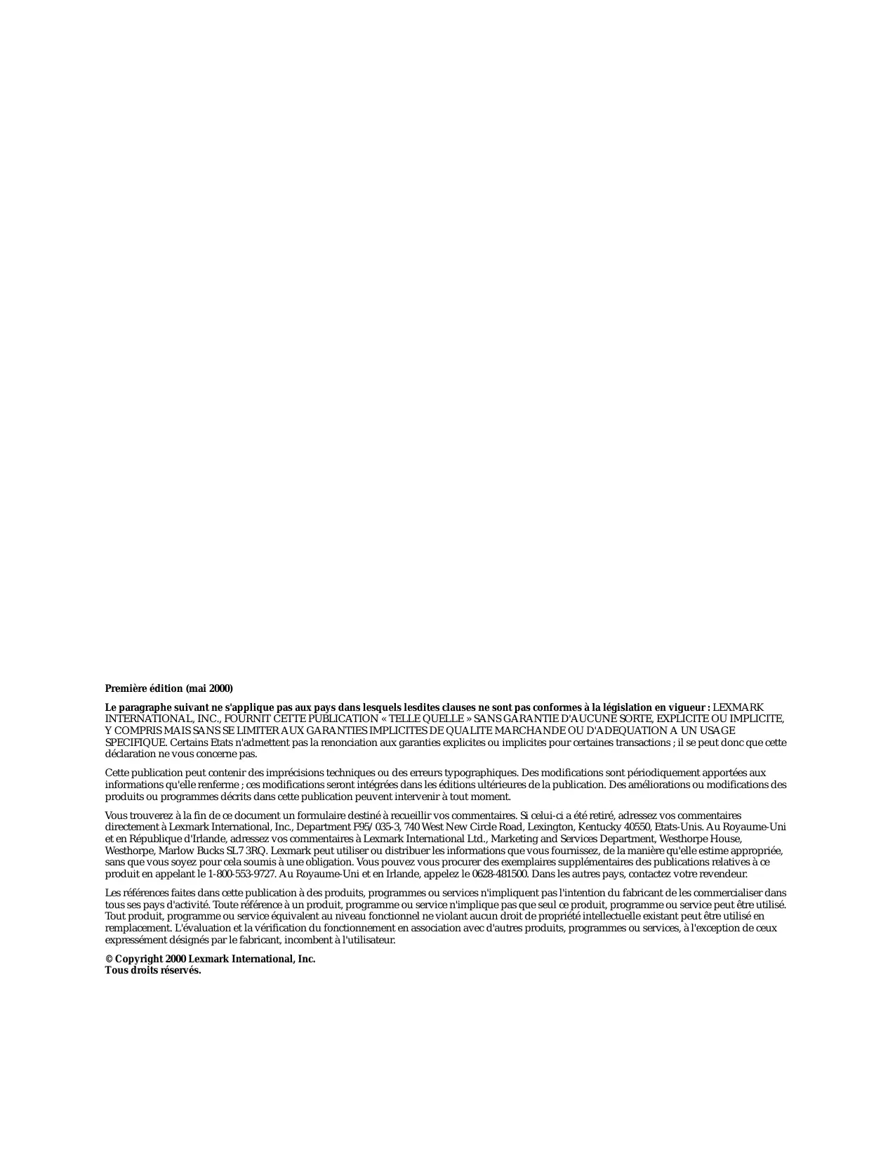 M410 M412 Première édition (mai 2000) Le paragraphe suivant ne s'applique pas aux pays dans lesquels lesdites clauses ne sont pas conformes à la législation en vigueur : LEXMARK INTERNATIONAL, INC., FOURNIT CETTE PUBLICATION « TELLE QUELLE » SANS GARANTIE D'AUCUNE SORTE, EXPLICITE OU IMPLICITE, Y COMPRIS MAIS SANS SE LIMITER AUX GARANTIES IMPLICITES DE QUALITE MARCHANDE OU D'ADEQUATION A UN USAGE SPECIFIQUE. Certains Etats n'admettent pas la renonciation aux garanties explicites ou implicites pour certaines transactions ; il se peut donc que cette déclaration ne vous concerne pas. Cette publication peut contenir des imprécisions techniques ou des erreurs typographiques. Des modifications sont périodiquement apportées aux informations qu'elle renferme ; ces modifications seront intégrées dans les éditions ultérieures de la publication. Des améliorations ou modifications des produits ou programmes décrits dans cette publication peuvent intervenir à tout moment. Vous trouverez à la fin de ce document un formulaire destiné à recueillir vos commentaires. Si celui-ci a été retiré, adressez vos commentaires directement à Lexmark International, Inc., Department F95/035-3, 740 West New Circle Road, Lexington, Kentucky 40550, Etats-Unis. Au Royaume-Uni et en République d'Irlande, adressez vos commentaires à Lexmark International Ltd., Marketing and Services Department, Westhorpe House, Westhorpe, Marlow Bucks SL7 3RQ. Lexmark peut utiliser ou distribuer les informations que vous fournissez, de la manière qu'elle estime appropriée, sans que vous soyez pour cela soumis à une obligation. Vous pouvez vous procurer des exemplaires supplémentaires des publications relatives à ce produit en appelant le 1-800-553-9727. Au Royaume-Uni et en Irlande, appelez le 0628-481500. Dans les autres pays, contactez votre revendeur. Les références faites dans cette publication à des produits, programmes ou services n'impliquent pas l'intention du fabricant de les commercialiser dans tous ses pays d'activité. Toute référence à un produit, programme ou service n'implique pas que seul ce produit, programme ou service peut être utilisé. Tout produit, programme ou service équivalent au niveau fonctionnel ne violant aucun droit de propriété intellectuelle existant peut être utilisé en remplacement. L'évaluation et la vérification du fonctionnement en association avec d'autres produits, programmes ou services, à l'exception de ceux expressément désignés par le fabricant, incombent à l'utilisateur. © Copyright 2000 Lexmark International, Inc. Tous droits réservés. Table des matières Introduction ... ix A propos de ce guide ... ix Autres informations ... x Documents en ligne ... x Marques ... xiii