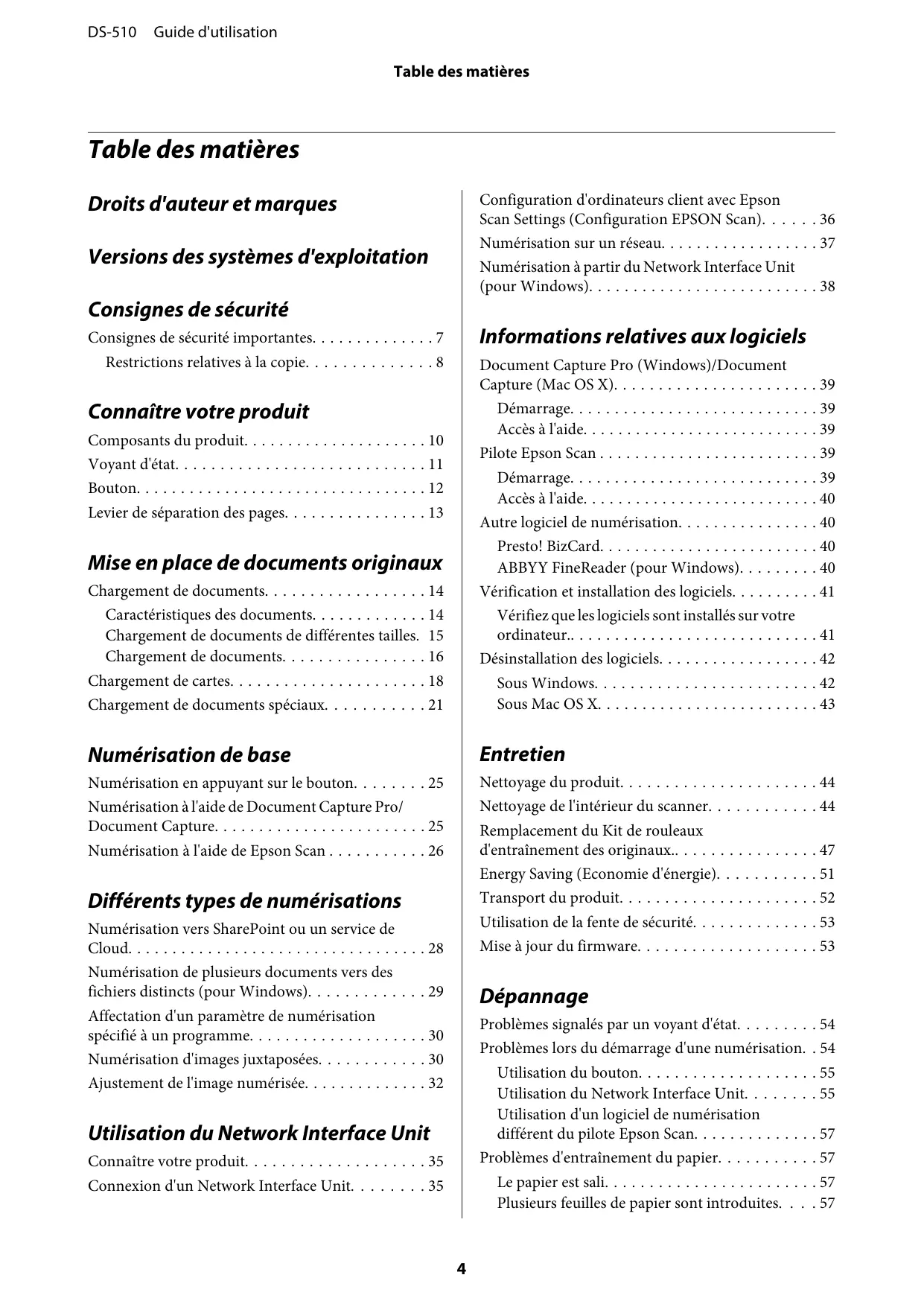 - DS-510 Guide d'utilisation Table des matières Il s'est produit une erreur d'alimentation double. 57 Le papier se coince dans le produit p. 58