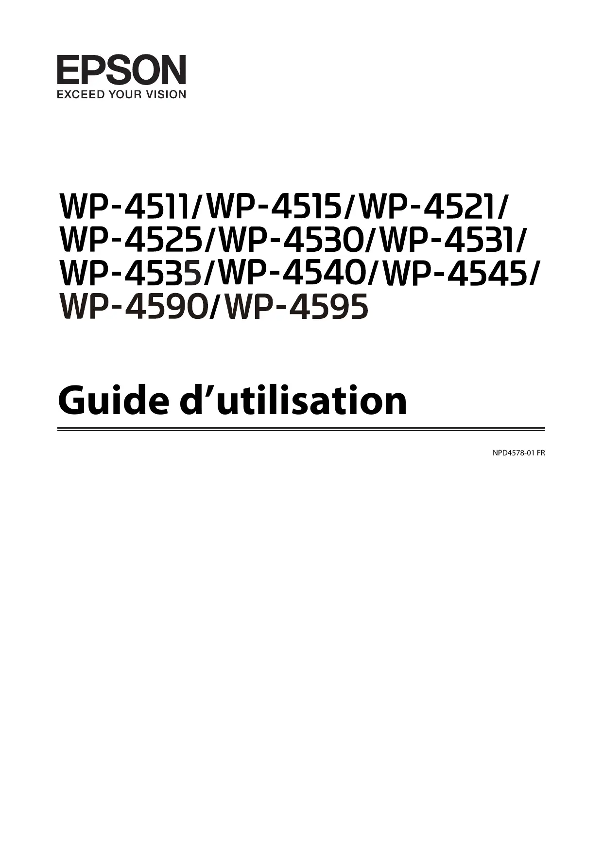 WP-4511/4515/4521/4525/4530/4531/4535/4540/4545/4590/4595 Guide d’utilisation Droits d'auteur et marques Droits d'auteur et marques Droits d'auteur et marques Aucune partie de ce manuel ne peut être reproduite, stockée dans un système documentaire ou transmise sous quelque forme ou de quelque manière que ce soit, électronique, mécanique, par photocopie, enregistrement ou autre, sans l'accord préalable écrit de Seiko Epson Corporation. L'utilisation des informations du présent manuel n'accorde aucune responsabilité en matière de brevets. Il en va de même pour les dommages résultant de l'utilisation des informations du présent manuel. Les informations contenues dans la présente notice sont exclusivement destinées à l'utilisation de ce produit Epson. Epson ne pourra être tenue responsable de l'utilisation de ces informations avec d'autres produits. Ni Seiko Epson Corporation ni ses filiales ne pourront être tenues responsables envers l’acquéreur de ce produit ou envers des tiers, des dommages, pertes, frais ou dépenses encourus par l’acquéreur ou les tiers à la suite des événements suivants : accident, utilisation incorrecte ou abusive de ce produit, modifications, réparations ou altérations illicites de ce produit ou (sauf aux États-Unis) non-respect au sens strict des consignes d’utilisation et de maintenance de Seiko Epson Corporation. Seiko Epson Corporation et ses filiales ne pourront être tenues responsables des dommages ou problèmes survenus par suite de l'utilisation de produits optionnels ou consommables autres que ceux désignés par Seiko Epson Corporation comme étant des Produits d’origine Epson ou des Produits approuvés par Epson. Seiko Epson Corporation ne pourra être tenue responsable des dommages résultant des interférences électromagnétiques se produisant à la suite de l'utilisation de câbles d'interface autres que ceux désignés par Seiko Epson Corporation comme étant des Produits approuvés par Epson.