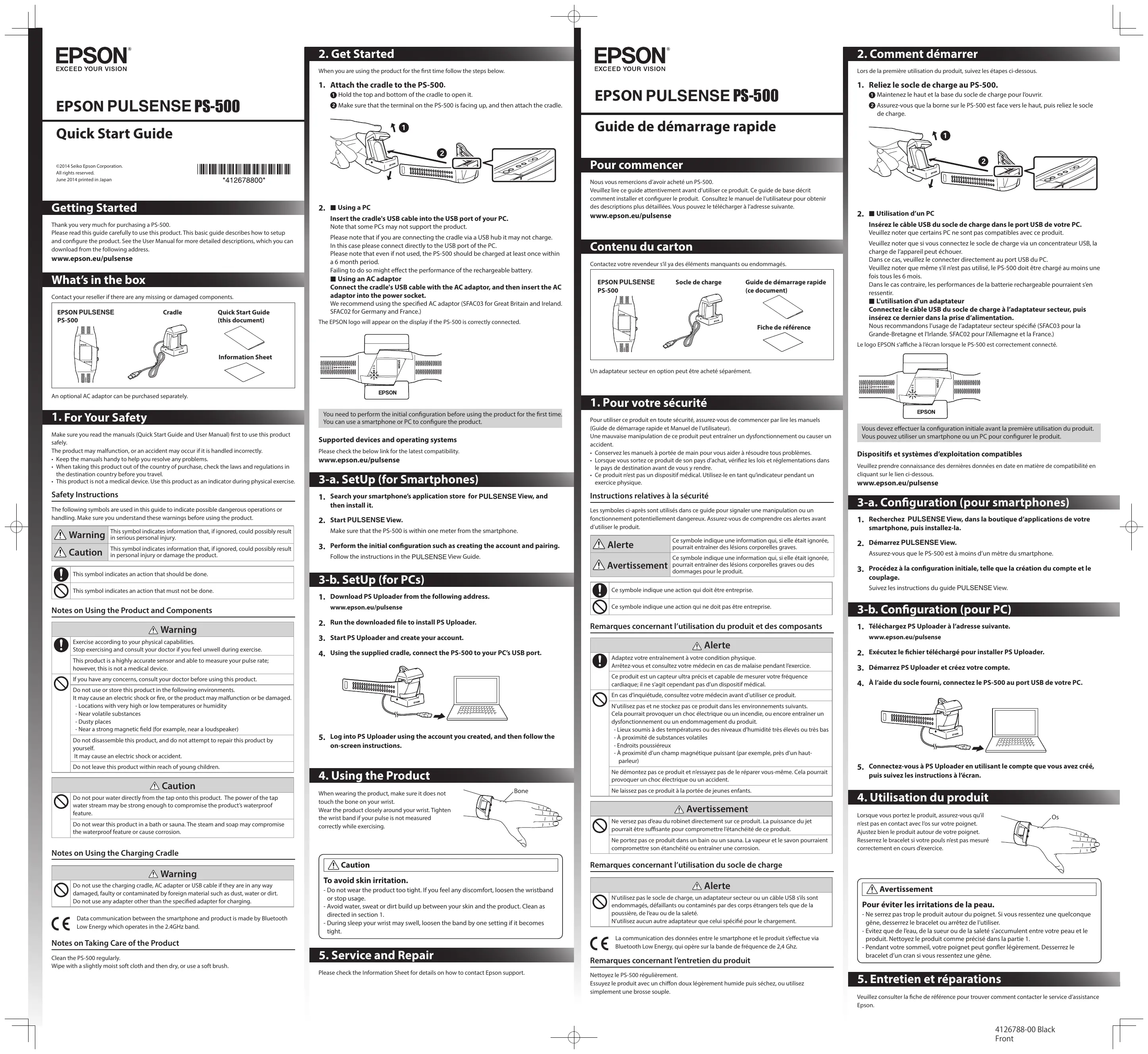 Insérez le câble USB du socle de charge dans le port USB de votre PC. Note that some PCs may not support the product. Please note that if you are connecting the cradle via a USB hub it may not charge. In this case please connect directly to the USB port of the PC. Please note that even if not used, the PS-500 should be charged at least once within a 6 month period. Failing to do so might effect the performance of the rechargeable battery. f Using an AC adaptor Connect the cradle's USB cable with the AC adaptor, and then insert the AC adaptor into the power socket. Veuillez noter que certains PC ne sont pas compatibles avec ce produit. Contenu du carton Contactez votre revendeur s’il ya des éléments manquants ou endommagés. EPSON PULSENSE PS-500 Socle de charge Guide de démarrage rapide (ce document) Veuillez noter que si vous connectez le socle de charge via un concentrateur USB, la charge de l’appareil peut échouer. Dans ce cas, veuillez le connecter directement au port USB du PC. Veuillez noter que même s’il n’est pas utilisé, le PS-500 doit être chargé au moins une fois tous les 6 mois. Dans le cas contraire, les performances de la batterie rechargeable pourraient s’en ressentir. f L'utilisation d'un adaptateur Connectez le câble USB du socle de charge à l’adaptateur secteur, puis insérez ce dernier dans la prise d’alimentation. We recommend using the specified AC adaptor (SFAC03 for Great Britain and Ireland. SFAC02 for Germany and France.) The EPSON logo will appear on the display if the PS-500 is correctly connected. Fiche de référence Nous recommandons l’usage de l’adaptateur secteur spécifié (SFAC03 pour la Grande-Bretagne et l'Irlande. SFAC02 pour l'Allemagne et la France.) Le logo EPSON s’affiche à l’écran lorsque le PS-500 est correctement connecté. Information Sheet Un adaptateur secteur en option peut être acheté séparément. An optional AC adaptor can be purchased separately.