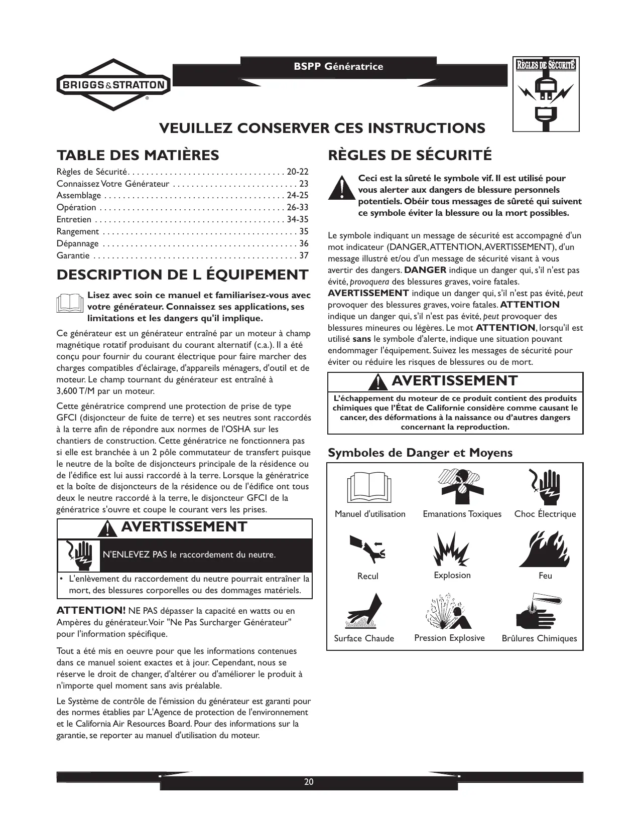 - L'enlèvement du raccordement du neutre pourrait entraîner la mort, des blessures corporelles ou des dommages matériels. Recul Explosion Feu ATTENTION! NE PAS dépasser la capacité en watts ou en Ampères du générateur.Voir "Ne Pas Surcharger Générateur" pour l'information spécifique. Surface Chaude Tout a été mis en oeuvre pour que les informations contenues dans ce manuel soient exactes et à jour. Cependant, nous se réserve le droit de changer, d'altérer ou d'améliorer le produit à n'importe quel moment sans avis préalable. Le Système de contrôle de l'émission du générateur est garanti pour des normes établies par L'Agence de protection de l'environnement et le California Air Resources Board. Pour des informations sur la garantie, se reporter au manuel d'utilisation du moteur.