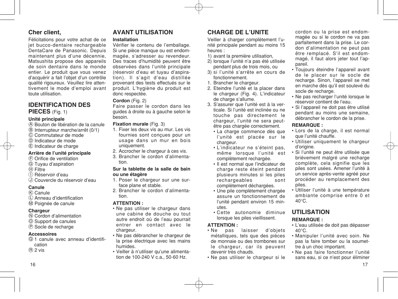 Félicitations pour votre achat de ce jet bucco-dentaire rechargeable DentaCare de Panasonic. Depuis maintainant plus d'une décennie, Matsushita propose des apparciels de soin dentaire dans le monde entier. Le produit que vous venez d'acquerir a fait l'objet d'un contrôle qualité rigoureux. Veuillez tire attentivement le mode d'emploi avant toute utilisation.
