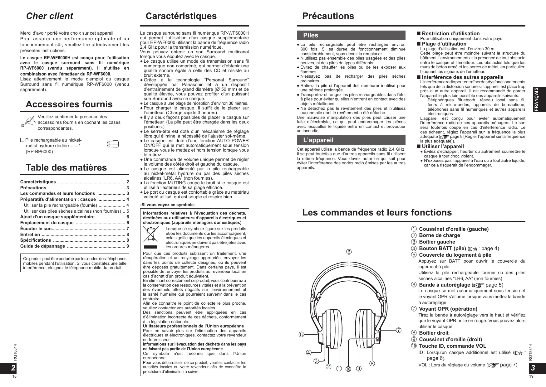 - Avant de raccorder, faire fonctionner ou régler l’appareil, lire attentivement tout ce mode d’emploi. Conserver ce manuel. POLSKI Le casque RP-WF6000H est conçu pour l’utilisation avec le casque surround sans fil numérique RP-WF6000 (vendu séparément). Il s’utilise en combinaison avec l’émetteur du RP-WF6000. Lisez attentivement le mode d’emploi du casque Surround sans fil numérique RP-WF6000 (vendu séparément). Accessoires fournis Veuillez confirmer la présence des accessoires fournis en cochant les cases correspondantes. Pile rechargeable au nickelmétal hydrure dédiée p. 1