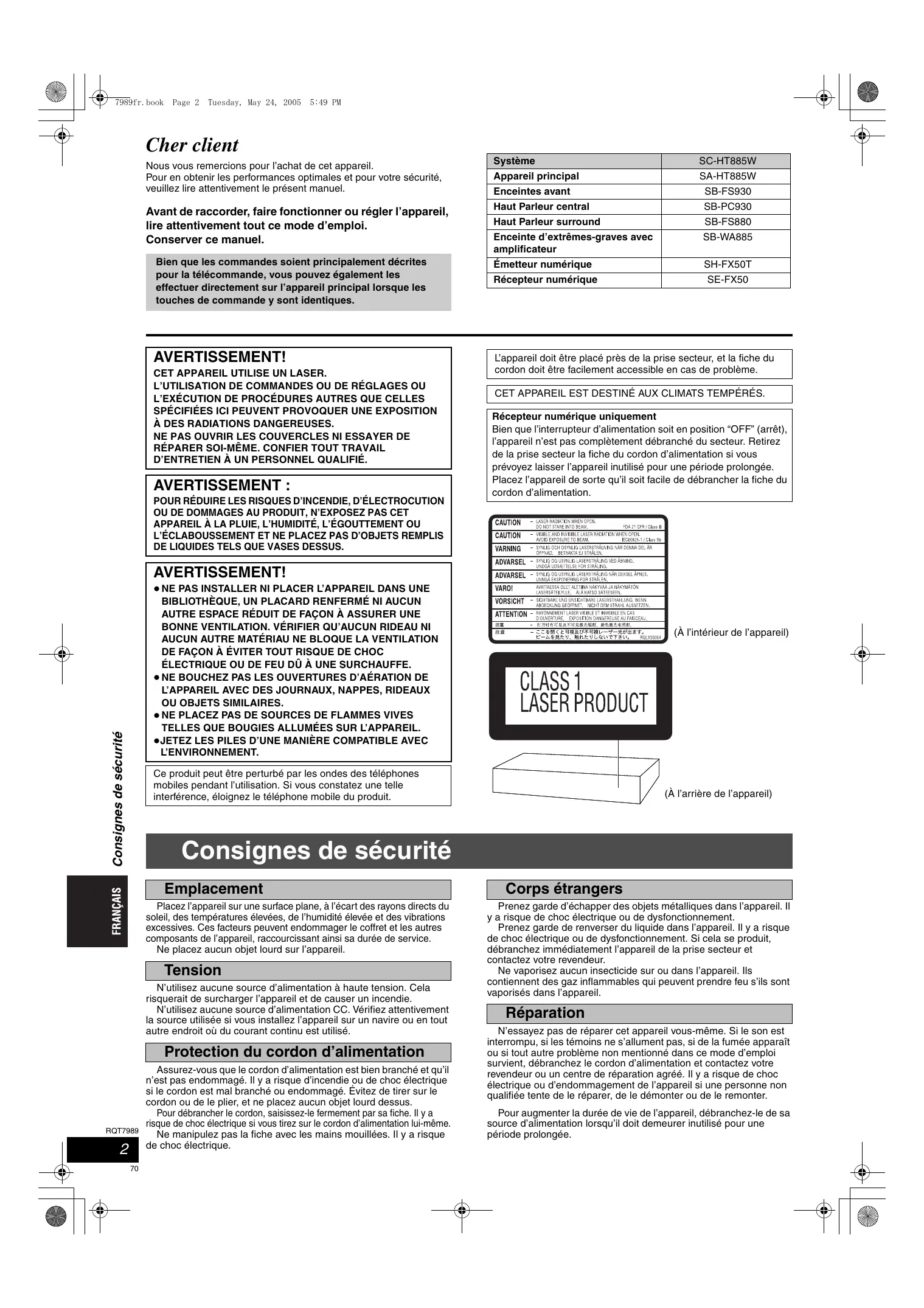 7989fr.book Page 2 Tuesday, May 24, 2005 5:49 PM Cher client Nous vous remercions pour l’achat de cet appareil. Pour en obtenir les performances optimales et pour votre sécurité, veuillez lire attentivement le présent manuel. Avant de raccorder, faire fonctionner ou régler l’appareil, lire attentivement tout ce mode d’emploi. Conserver ce manuel. Système SC-HT885W Appareil principal SA-HT885W Enceintes avant SB-FS930 Haut Parleur central SB-PC930 Haut Parleur surround SB-FS880 Enceinte d’extrêmes-graves avec amplificateur SB-WA885 Bien que les commandes soient principalement décrites pour la télécommande, vous pouvez également les effectuer directement sur l’appareil principal lorsque les touches de commande y sont identiques. Émetteur numérique SH-FX50T Récepteur numérique SE-FX50 AVERTISSEMENT! L’appareil doit être placé près de la prise secteur, et la fiche du cordon doit être facilement accessible en cas de problème. CET APPAREIL UTILISE UN LASER. L’UTILISATION DE COMMANDES OU DE RÉGLAGES OU L’EXÉCUTION DE PROCÉDURES AUTRES QUE CELLES SPÉCIFIÉES ICI PEUVENT PROVOQUER UNE EXPOSITION À DES RADIATIONS DANGEREUSES. NE PAS OUVRIR LES COUVERCLES NI ESSAYER DE RÉPARER SOI-MÊME. CONFIER TOUT TRAVAIL D’ENTRETIEN À UN PERSONNEL QUALIFIÉ.