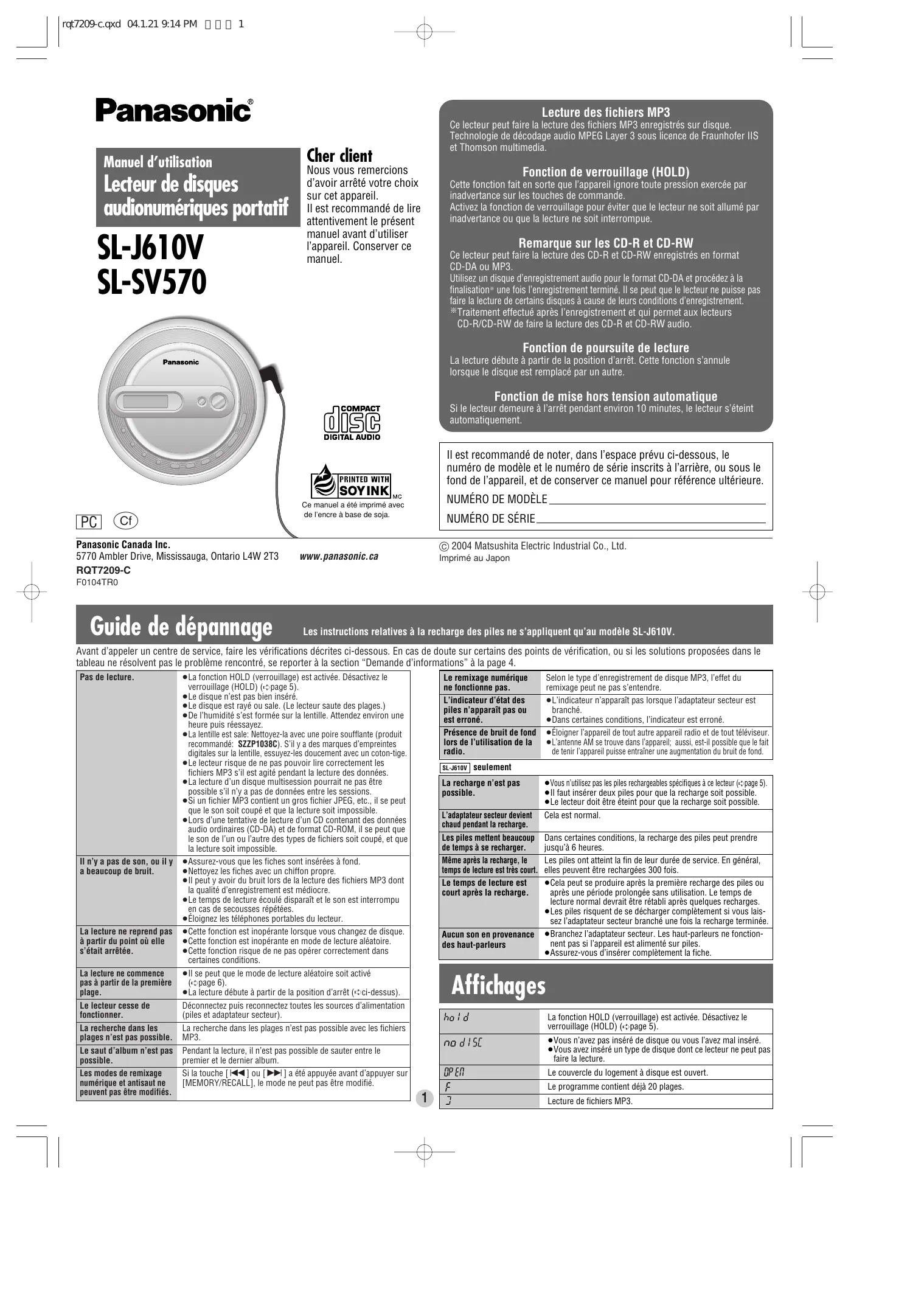 C 2004 Matsushita Electric Industrial Co., Ltd. www.panasonic.ca Imprimé au Japon F0104TR0 Guide de dépannage Les instructions relatives à la recharge des piles ne s’appliquent qu’au modèle SL-J610V. Avant d’appeler un centre de service, faire les vérifications décrites ci-dessous. En cas de doute sur certains des points de vérification, ou si les solutions proposées dans le tableau ne résolvent pas le problème rencontré, se reporter à la section “Demande d’informations” à la page 4. Pas de lecture. Il n’y a pas de son, ou il y a beaucoup de bruit. La lecture ne reprend pas à partir du point où elle s’était arrêtée. La lecture ne commence pas à partir de la première plage. Le lecteur cesse de fonctionner. La recherche dans les plages n’est pas possible. Le saut d’album n’est pas possible. Les modes de remixage numérique et antisaut ne peuvent pas être modifiés. ≥La fonction HOLD (verrouillage) est activée. Désactivez le verrouillage (HOLD) (➪page 5). ≥Le disque n’est pas bien inséré. ≥Le disque est rayé ou sale. (Le lecteur saute des plages.) ≥De l’humidité s’est formée sur la lentille. Attendez environ une heure puis réessayez. ≥La lentille est sale: Nettoyez-la avec une poire soufflante (produit recommandé: SZZP1038C). S’il y a des marques d’empreintes digitales sur la lentille, essuyez-les doucement avec un coton-tige. ≥Le lecteur risque de ne pas pouvoir lire correctement les fichiers MP3 s’il est agité pendant la lecture des données. ≥La lecture d’un disque multisession pourrait ne pas être possible s’il n’y a pas de données entre les sessions. ≥Si un fichier MP3 contient un gros fichier JPEG, etc., il se peut que le son soit coupé et que la lecture soit impossible. ≥Lors d’une tentative de lecture d’un CD contenant des données audio ordinaires (CD-DA) et de format CD-ROM, il se peut que le son de l’un ou l’autre des types de fichiers soit coupé, et que la lecture soit impossible. ≥Assurez-vous que les fiches sont insérées à fond. ≥Nettoyez les fiches avec un chiffon propre. ≥Il peut y avoir du bruit lors de la lecture des fichiers MP3 dont la qualité d’enregistrement est médiocre. ≥Le temps de lecture écoulé disparaît et le son est interrompu en cas de secousses répétées. ≥Éloignez les téléphones portables du lecteur. ≥Cette fonction est inopérante lorsque vous changez de disque. ≥Cette fonction est inopérante en mode de lecture aléatoire. ≥Cette fonction risque de ne pas opérer correctement dans certaines conditions. ≥Il se peut que le mode de lecture aléatoire soit activé (➪page 6). ≥La lecture débute à partir de la position d’arrêt (➪ci-dessus). Déconnectez puis reconnectez toutes les sources d’alimentation (piles et adaptateur secteur). La recherche dans les plages n’est pas possible avec les fichiers MP3. Pendant la lecture, il n’est pas possible de sauter entre le premier et le dernier album. Si la touche [:] ou [9] a été appuyée avant d’appuyer sur [MEMORY/RECALL], le mode ne peut pas être modifié. Le remixage numérique ne fonctionne pas. L’indicateur d’état des piles n’apparaît pas ou est erroné. Présence de bruit de fond lors de l’utilisation de la radio. SL-J610V Selon le type d’enregistrement de disque MP3, l’effet du remixage peut ne pas s’entendre. ≥L’indicateur n’apparaît pas lorsque l’adaptateur secteur est branché. ≥Dans certaines conditions, l’indicateur est erroné. ≥Éloigner l’appareil de tout autre appareil radio et de tout téléviseur. ≥L’antenne AM se trouve dans l’appareil; aussi, est-il possible que le fait de tenir l’appareil puisse entraîner une augmentation du bruit de fond. seulement La recharge n’est pas possible. L’adaptateur secteur devient chaud pendant la recharge. Les piles mettent beaucoup de temps à se recharger. Même après la recharge, le temps de lecture est très court. Le temps de lecture est court après la recharge. Aucun son en provenance des haut-parleurs ≥Vous n’utilisez pas les piles rechargeables spécifiques à ce lecteur (➪page 5). ≥Il faut insérer deux piles pour que la recharge soit possible. ≥Le lecteur doit être éteint pour que la recharge soit possible. Cela est normal. Dans certaines conditions, la recharge des piles peut prendre jusqu’à 6 heures. Les piles ont atteint la fin de leur durée de service. En général, elles peuvent être rechargées 300 fois. ≥Cela peut se produire après la première recharge des piles ou après une période prolongée sans utilisation. Le temps de lecture normal devrait être rétabli après quelques recharges. ≥Les piles risquent de se décharger complètement si vous laissez l’adaptateur secteur branché une fois la recharge terminée. ≥Branchez l’adaptateur secteur. Les haut-parleurs ne fonctionnent pas si l’appareil est alimenté sur piles. ≥Assurez-vous d’insérer complètement la fiche. Affichages