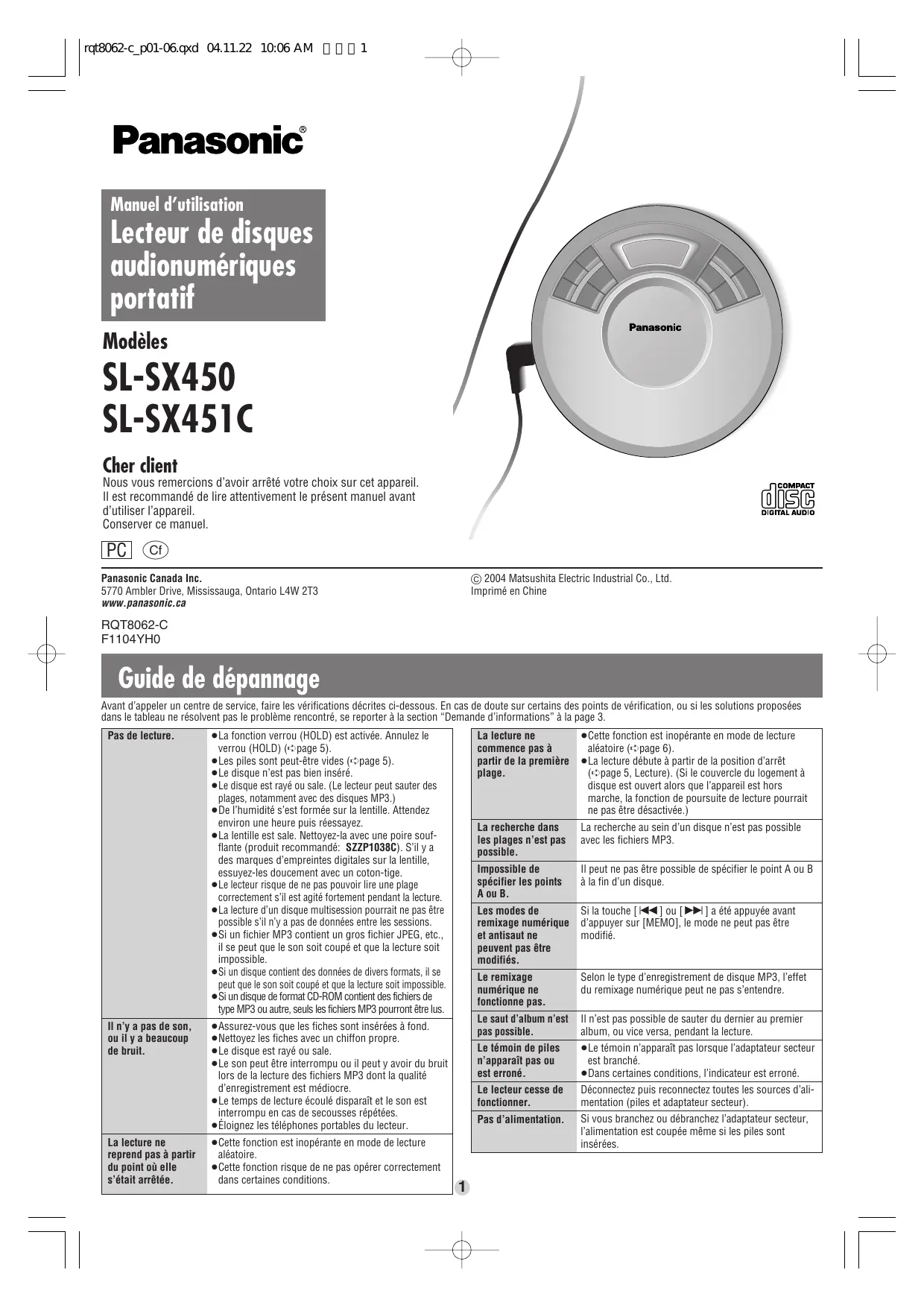 Retrouvez gratuitement la notice de l'appareil SL-SX450 PANASONIC au format PDF.