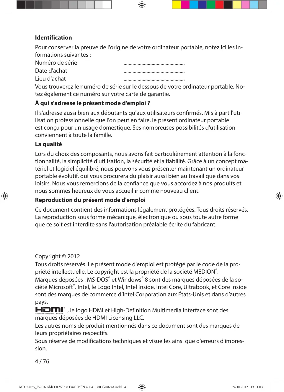 Identification Pour conserver la preuve de l'origine de votre ordinateur portable, notez ici les informations suivantes : Numéro de série Date d'achat Lieu d'achat Vous trouverez le numéro de série sur le dessous de votre ordinateur portable. Notez également ce numéro sur votre carte de garantie. À qui s'adresse le présent mode d'emploi ? Il s'adresse aussi bien aux débutants qu'aux utilisateurs confirmés. Mis à part l'utilisation professionnelle que l'on peut en faire, le présent ordinateur portable est conçu pour un usage domestique. Ses nombreuses possibilités d'utilisation conviennent à toute la famille. La qualité Lors du choix des composants, nous avons fait particulièrement attention à la fonctionnalité, la simplicité d'utilisation, la sécurité et la fiabilité. Grâce à un concept matériel et logiciel équilibré, nous pouvons vous présenter maintenant un ordinateur portable évolutif, qui vous procurera du plaisir aussi bien au travail que dans vos loisirs. Nous vous remercions de la confiance que vous accordez à nos produits et nous sommes heureux de vous accueillir comme nouveau client. Reproduction du présent mode d'emploi Ce document contient des informations légalement protégées. Tous droits réservés. La reproduction sous forme mécanique, électronique ou sous toute autre forme que ce soit est interdite sans l'autorisation préalable écrite du fabricant. Copyright © 2012 Tous droits réservés. Le présent mode d'emploi est protégé par le code de la propriété intellectuelle. Le copyright est la propriété de la société MEDION®. Marques déposées : MS-DOS® et Windows® 8 sont des marques déposées de la société Microsoft®. Intel, le Logo Intel, Intel Inside, Intel Core, Ultrabook, et Core Inside sont des marques de commerce d’Intel Corporation aux États-Unis et dans d’autres pays. , le logo HDMI et High-Definition Multimedia Interface sont des marques déposées de HDMI Licensing LLC. Les autres noms de produit mentionnés dans ce document sont des marques de leurs propriétaires respectifs. Sous réserve de modifications techniques et visuelles ainsi que d'erreurs d'impression. 4 / 76 MD 99075_P7816 Aldi FR Win 8 Final MSN 4004 3080 Content.indd 4