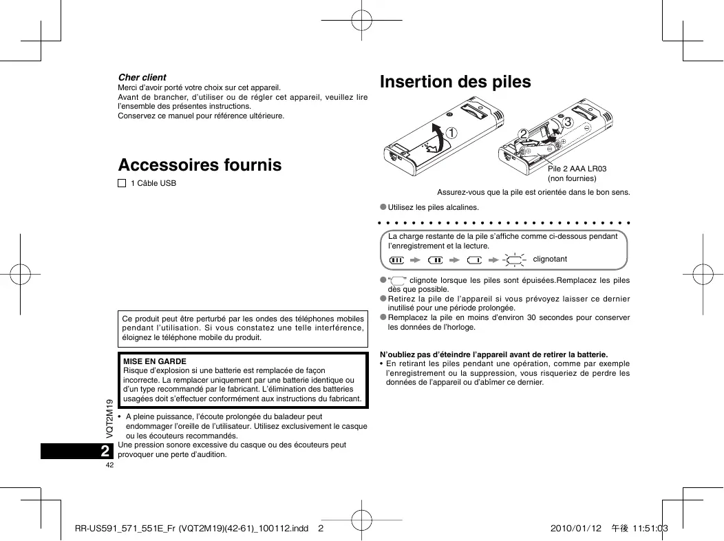 - Le haut-parleur de l’appareil n’a pas de blindage magnétique. Ne placez pas l’appareil près d’un téléviseur, d’un ordinateur, de cartes magnétiques (cartes bancaires, titres de transport) ou de tout autre appareil sensible au magnétisme. VQT2M19 g Piles