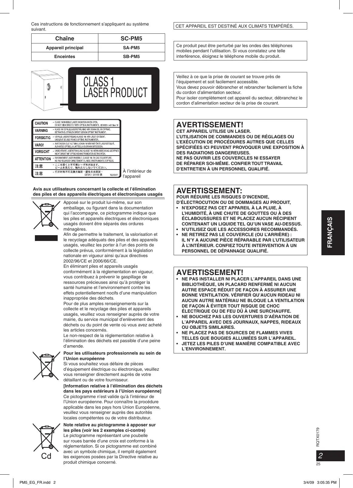 - NE RETIREZ PAS LE COUVERCLE (OU L’ARRIÈRE) : IL N’Y A AUCUNE PIÈCE RÉPARABLE PAR L’UTILISATEUR À L’INTÉRIEUR. CONFIEZ TOUTE INTERVENTION À UN PERSONNEL DE DÉPANNAGE QUALIFIÉ. FRANÇAIS À I’intérieur de l’appareil Note relative au pictogramme à apposer sur les piles (voir les 2 exemples ci-contre) Le pictogramme représentant une poubelle sur roues barrée d’une croix est conforme à la réglementation. Si ce pictogramme est combiné avec un symbole chimique, il remplit également les exigences posées par la Directive relative au produit chimique concerné. PM5_EG_FR.indd 2 RQTX0179 Pour les utilisateurs professionnels au sein de l’Union européenne Si vous souhaitez vous défaire de pièces d’équipement électrique ou électronique, veuillez vous renseigner directement auprès de votre détaillant ou de votre fournisseur. [Information relative à l’élimination des déchets dans les pays extérieurs à l’Union européenne] Ce pictogramme n’est valide qu’à l’intérieur de l’Union européenne. Pour connaître la procédure applicable dans les pays hors Union Européenne, veuillez vous renseigner auprès des autorités locales compétentes ou de votre distributeur.