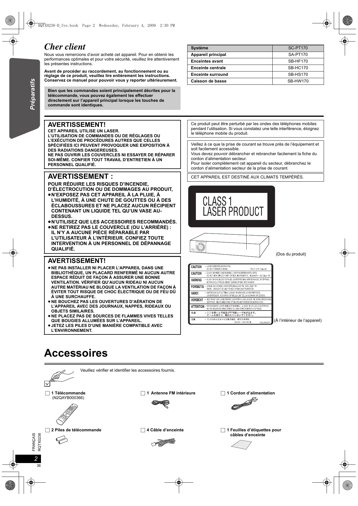 RQTX0238-D_fre.book Page 2 Wednesday, February 4, 2009 2:30 PM Cher client Système Nous vous remercions d’avoir acheté cet appareil. Pour en obtenir les performances optimales et pour votre sécurité, veuillez lire attentivement les présentes instructions. Préparatifs Avant de procéder au raccordement, au fonctionnement ou au réglage de ce produit, veuillez lire entièrement les instructions. Conservez ce manuel pour pouvoir vous y reporter ultérieurement. SC-PT170 Appareil principal SA-PT170 Enceintes avant SB-HF170 Enceinte centrale SB-HC170 Enceinte surround SB-HS170 Caisson de basse SB-HW170 Bien que les commandes soient principalement décrites pour la télécommande, vous pouvez également les effectuer directement sur l’appareil principal lorsque les touches de commande sont identiques. AVERTISSEMENT! Playing Discs CET APPAREIL UTILISE UN LASER. L’UTILISATION DE COMMANDES OU DE RÉGLAGES OU L’EXÉCUTION DE PROCÉDURES AUTRES QUE CELLES SPÉCIFIÉES ICI PEUVENT PROVOQUER UNE EXPOSITION À DES RADIATIONS DANGEREUSES. NE PAS OUVRIR LES COUVERCLES NI ESSAYER DE RÉPARER SOI-MÊME. CONFIER TOUT TRAVAIL D’ENTRETIEN À UN PERSONNEL QUALIFIÉ.