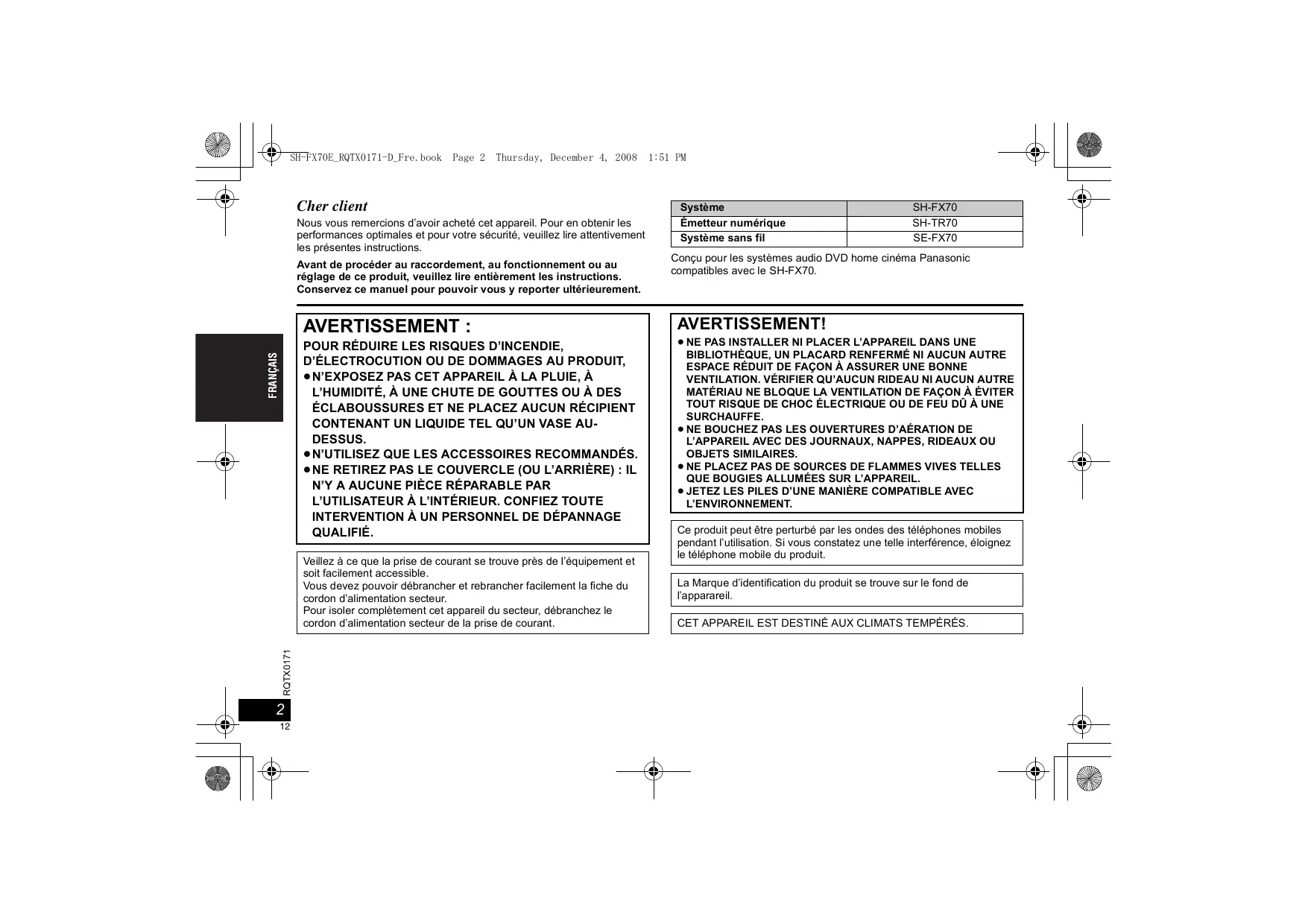 - 1:51 PM Système Émetteur numérique Système sans fil Conçu pour les systèmes audio DVD home cinéma Panasonic compatibles avec le SH-FX70. AVERTISSEMENT! ≥ NE PAS INSTALLER NI PLACER L’APPAREIL DANS UNE BIBLIOTHÈQUE, UN PLACARD RENFERMÉ NI AUCUN AUTRE ESPACE RÉDUIT DE FAÇON À ASSURER UNE BONNE VENTILATION. VÉRIFIER QU’AUCUN RIDEAU NI AUCUN AUTRE MATÉRIAU NE BLOQUE LA VENTILATION DE FAÇON À ÉVITER TOUT RISQUE DE CHOC ÉLECTRIQUE OU DE FEU DÛ À UNE SURCHAUFFE. ≥ NE BOUCHEZ PAS LES OUVERTURES D’AÉRATION DE L’APPAREIL AVEC DES JOURNAUX, NAPPES, RIDEAUX OU OBJETS SIMILAIRES. ≥ NE PLACEZ PAS DE SOURCES DE FLAMMES VIVES TELLES QUE BOUGIES ALLUMÉES SUR L’APPAREIL. ≥ JETEZ LES PILES D’UNE MANIÈRE COMPATIBLE AVEC L’ENVIRONNEMENT. Ce produit peut être perturbé par les ondes des téléphones mobiles pendant l’utilisation. Si vous constatez une telle interférence, éloignez le téléphone mobile du produit. La Marque d’identification du produit se trouve sur le fond de l’apparareil. CET APPAREIL EST DESTINÉ AUX CLIMATS TEMPÉRÉS. Table Des Matières Accessoires p. 3