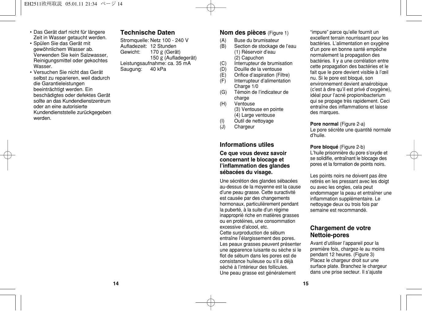 - Versuchen Sie nicht das Gerät selbst zu reparieren, weil dadurch die Garantieleistungen beeinträchtigt werden. Ein beschädigtes oder defektes Gerät sollte an das Kundendienstzentrum oder an eine autorisierte Kundendienststelle zurückgegeben werden. Technische Daten Nom des pièces (Figure 1) Stromquelle: Netz 100 - 240 V Aufladezeit: 12 Stunden Gewicht: 170 g (Gerät) 150 g (Aufladegerät) Leistungsaufnahme: ca. 35 mA Saugung: 40 kPa (A) (B) (C) (D) (E) (F) (G) (H) (I) (J) “impure” parce qu’elle fournit un excellent terrain nourrissant pour les bactéries. L’alimentation en oxygène d’un pore en bonne santé empêche normalement la propagation des bactéries. Il y a une corrélation entre cette propagation des bactéries et le fait que le pore devient visible à l’œil nu. Si le pore est bloqué, son environnement devient anaérobique (c’est à dire qu’il est privé d’oxygène), idéal pour l’acné propionibacterium qui se propage très rapidement. Ceci entraîne des inflammations et laisse des marques. Buse du brumisateur Section de stockage de l’eau (1) Réservoir d’eau (2) Capuchon Interrupteur de brumisation Douille de la ventouse Orifice d’aspiration (Filtre) Interrupteur d’alimentation Charge 1/0 Témoin de l’indicateur de charge Ventouse (3) Ventouse en pointe (4) Large ventouse Outil de nettoyage Chargeur Pore normal (Figure 2-a) Le pore sécrète une quantité normale d’huile. Informations utiles Pore bloqué (Figure 2-b) L’huile prisonnière du pore s’oxyde et se solidifie, entraînant le blocage des pores et la formation de points noirs. Ce que vous devez savoir concernant le blocage et l’inflammation des glandes sébacées du visage. Les points noirs ne doivent pas être retirés en les pressant avec les doigt ou avec les ongles, cela peut endommager la peau et entraîner une inflammation supplémentaire. Le nettoyage deux ou trois fois par semaine est recommandé. Une sécrétion des glandes sébacées au-dessus de la moyenne est la cause d’une peau grasse. Cette suractivité est causée par des changements hormonaux, particulièrement pendant la puberté, à la suite d’un régime inapproprié riche en matières grasses ou en protéines, une consommation excessive d’alcool, etc. Cette surproduction de sébum entraîne l’élargissement des pores. Les peaux grasses peuvent présenter une apparence luisante ou sèche si le flot de sébum dans les pores est de consistance huileuse ou s’il a déjà séché à l’intérieur des follicules. Une peau grasse est généralement