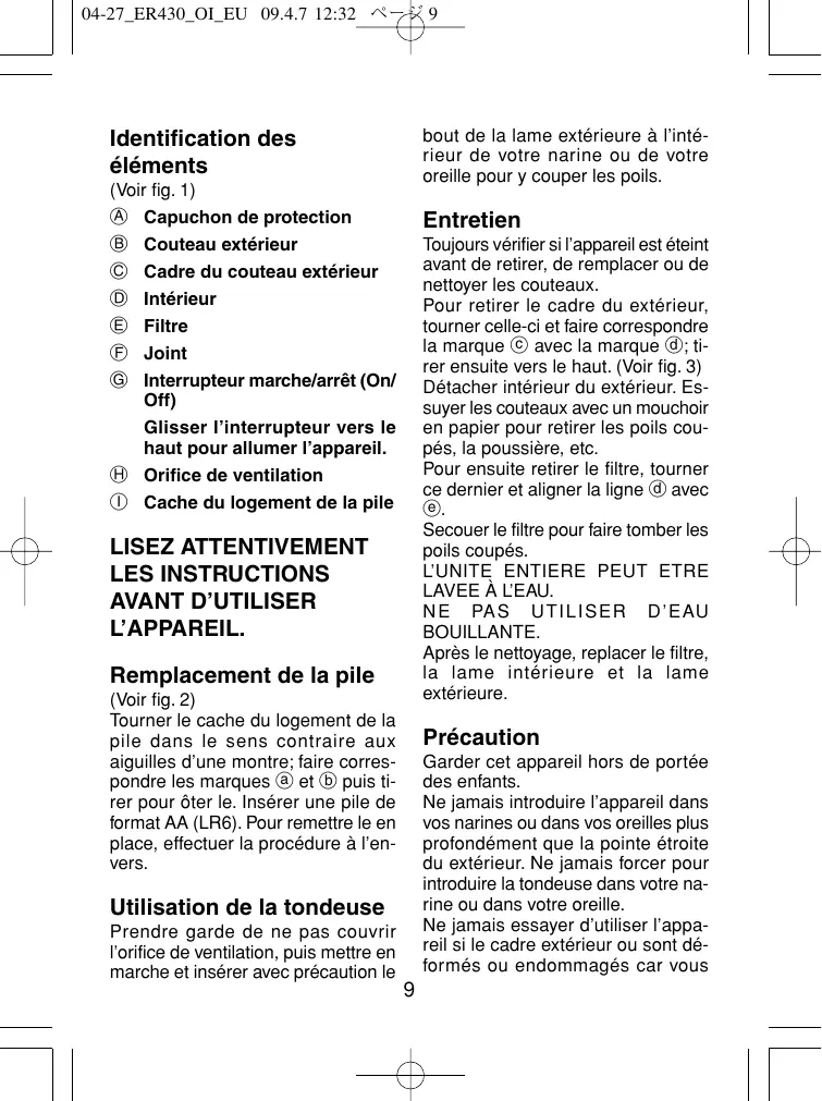 Cette tondeuse a ete conque uniquement pour couper les poils des nariines ou des oreilles. Ne jamais essayer de l'utiliser a d'autres fins. Les lames ont ete fabriquees minutieusement. Ne jamais les forcer ou les soumettre a un impact, etc.