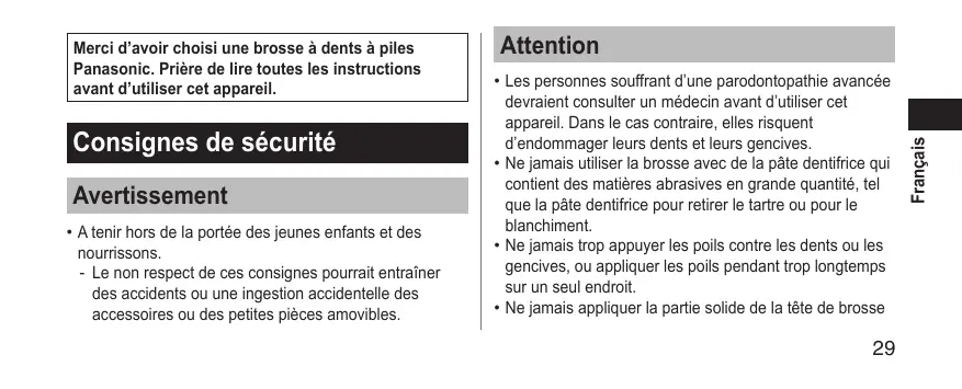 Merci d’avoir choisi une brosse à dents à piles Panasonic. Prière de lire toutes les instructions avant d’utiliser cet appareil. Français sur les dents.