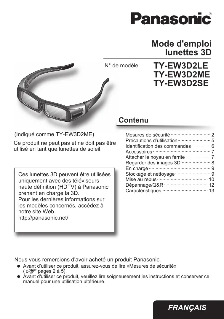 TY-EW3D2LE - Accessoires de télévision PANASONIC - Notice d'utilisation et mode d'emploi gratuit