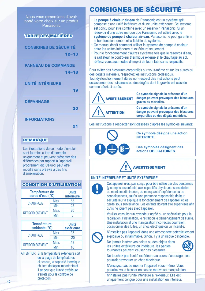 - Pour le fonctionnement d’autres systèmes tels que le réservoir d’eau, le radiateur, le contrôleur thermique externe et le chauffage au sol, référez-vous aux modes d’emploi de leurs fabricants respectifs. ATTENTION: Si la température extérieure sort de la plage de températures ci-dessus, la capacité thermique chutera de façon importante et il se peut que l’unité extérieure s’arrête pour le contrôle de protection. Ces symboles désignent des actions OBLIGATOIRES. AVERTISSEMENT UNITÉ INTÉRIEURE ET UNITÉ EXTÉRIEURE Cet appareil n’est pas conçu pour être utilisé par des personnes (y compris les enfants) aux capacités physiques, sensorielles ou mentales diminuées, ou manquant d’expérience ou de connaissances, sauf si une personne responsable de leur sécurité leur a expliqué le fonctionnement de l’appareil et les garde sous surveillance. Les enfants doivent être supervisés afin qu’ils ne jouent pas avec l’appareil. Veuillez consulter un revendeur agréé ou un spécialiste pour la réparation, l’installation, le retrait ou le déménagement de l’unité. Une installation et une manipulation incorrectes pourraient occasionner des fuites, un choc électrique ou un incendie. N’installez pas l’appareil dans une atmosphère potentiellement explosive ou inflammable. Sinon, il y a un risque d’incendie. Ne jamais insérer vos doigts ou des objets dans les unités extérieure ou intérieure, les parties tournantes peuvent causer des blessures. Ne touchez pas l’unité extérieure au cours d’un orage, cela pourrait provoquer un choc électrique. N’essayez pas de réparer l’appareil vous-même. Vous pourriez vous blesser en cas de mauvaise manipulation. N’installez pas l’unité intérieure à l’extérieur. Elle est uniquement conçue pour une installation en intérieur. AVERTISSEMENT Prévenez les chocs électriques coupant l’alimentation: - Avant le nettoyage ou l’entretien. - En cas de non-utilisation prolongée. - En cas d’activité orageuse anormalement forte. Cet appareil convient à de multiples usages. Tous les circuits d’alimentation électrique doivent être coupés avant toute intervention sur les bornes de l’unité intérieure, afin d’éviter tout choc électrique, brûlure ou blessure mortelle. Cesser d’utiliser le produit lorsqu’une anomalie ou défaillance quelconque se produit et débrancher la fiche d’alimentation ou mettre hors tension l’interrupteur et le disjoncteur. (Risque de fumée/feu/choc électrique)