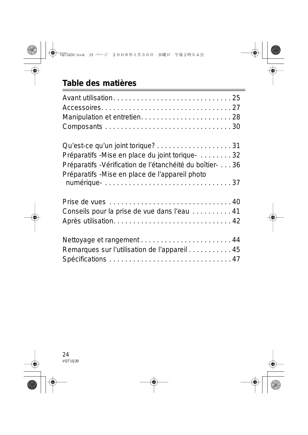 Qu’est-ce qu’un joint torique? ≥ Un joint torique est une garniture étanche utilisée pour les appareils photo, montres ou équipements de plongée. ≥ Le joint torique rend le boîtier étanche en scellant l’espace entre sa partie avant et arrière. ∫ Comment le joint torique rend le boîtier étanche Couvercle arrière Appareil photo numérique Joint torique Couvercle avant Le caoutchouc du joint torique entre en contact avec les côtés du boîtier, le rendant ainsi étanche et empêchant l’eau d’entrer par l’ouverture. Pression de l’eau Eau Joint torique Joint torique Quand le joint torique est écrasé par la pression de l’eau, sa surface s’élargit et le boîtier est scellé plus hermétiquement. Le joint torique évite les infiltrations d’eau en uniformisant le contact des deux côtés du boîtier. Donc, le bon entretien du joint torique est très important. Un mauvais entretien peut causer des infiltrations d’eau.