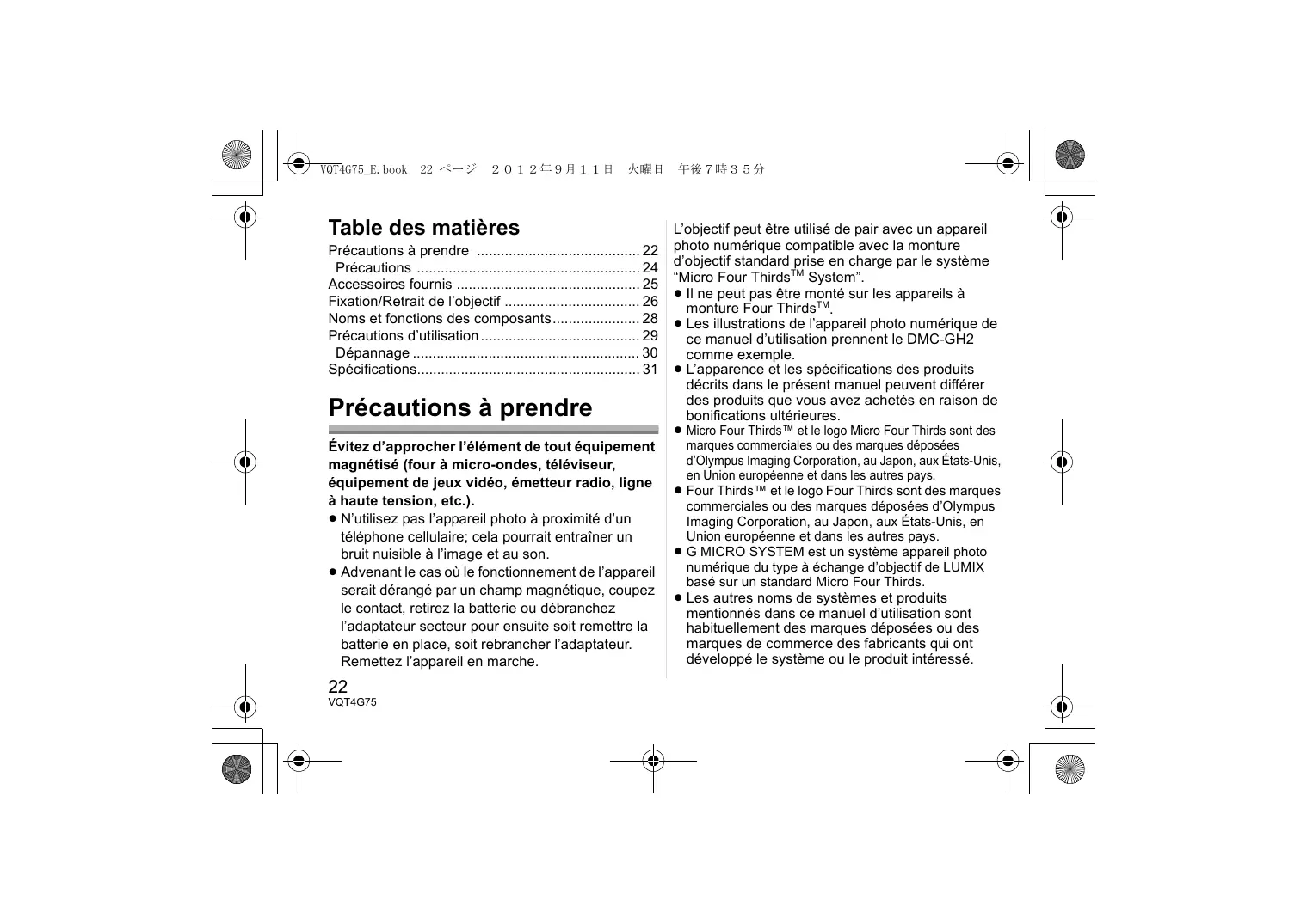 L’objectif peut être utilisé de pair avec un appareil photo numérique compatible avec la monture d’objectif standard prise en charge par le système “Micro Four ThirdsTM System”. ≥ Il ne peut pas être monté sur les appareils à monture Four ThirdsTM. ≥ Les illustrations de l’appareil photo numérique de ce manuel d’utilisation prennent le DMC-GH2 comme exemple. ≥ L’apparence et les spécifications des produits décrits dans le présent manuel peuvent différer des produits que vous avez achetés en raison de bonifications ultérieures. ≥ Micro Four Thirds™ et le logo Micro Four Thirds sont des marques commerciales ou des marques déposées d’Olympus Imaging Corporation, au Japon, aux États-Unis, en Union européenne et dans les autres pays. ≥ Four Thirds™ et le logo Four Thirds sont des marques commerciales ou des marques déposées d’Olympus Imaging Corporation, au Japon, aux États-Unis, en Union européenne et dans les autres pays. ≥ G MICRO SYSTEM est un système appareil photo numérique du type à échange d’objectif de LUMIX basé sur un standard Micro Four Thirds. ≥ Les autres noms de systèmes et produits mentionnés dans ce manuel d’utilisation sont habituellement des marques déposées ou des marques de commerce des fabricants qui ont développé le système ou le produit intéressé. VQT4G75_E.book 23 ページ