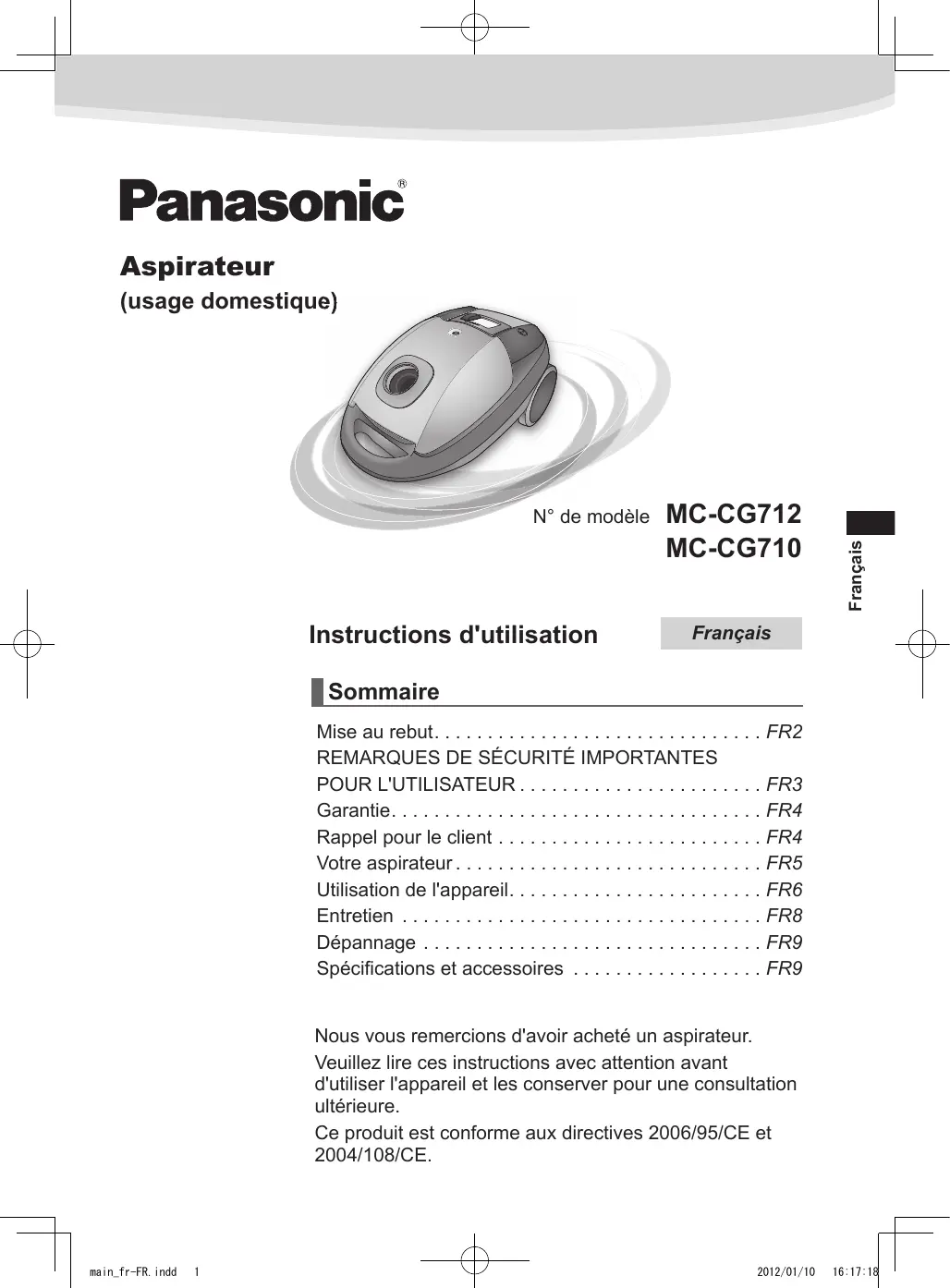 Sommaire Mise au rebut. . . . . . . . . . . . . . . . . . . . . . . . . . . . . . . FR2 REMARQUES DE SÉCURITÉ IMPORTANTES POUR L'UTILISATEUR . . . . . . . . . . . . . . . . . . . . . . . FR3 Garantie. . . . . . . . . . . . . . . . . . . . . . . . . . . . . . . . . . . FR4 Rappel pour le client . . . . . . . . . . . . . . . . . . . . . . . . . FR4 Votre aspirateur . . . . . . . . . . . . . . . . . . . . . . . . . . . . . FR5 Utilisation de l'appareil. . . . . . . . . . . . . . . . . . . . . . . . FR6 Entretien . . . . . . . . . . . . . . . . . . . . . . . . . . . . . . . . . . FR8 Dépannage . . . . . . . . . . . . . . . . . . . . . . . . . . . . . . . . FR9 Spécifications et accessoires . . . . . . . . . . . . . . . . . . FR9 Nous vous remercions d'avoir acheté un aspirateur. Veuillez lire ces instructions avec attention avant d'utiliser l'appareil et les conserver pour une consultation ultérieure. Ce produit est conforme aux directives 2006/95/CE et 2004/108/CE.