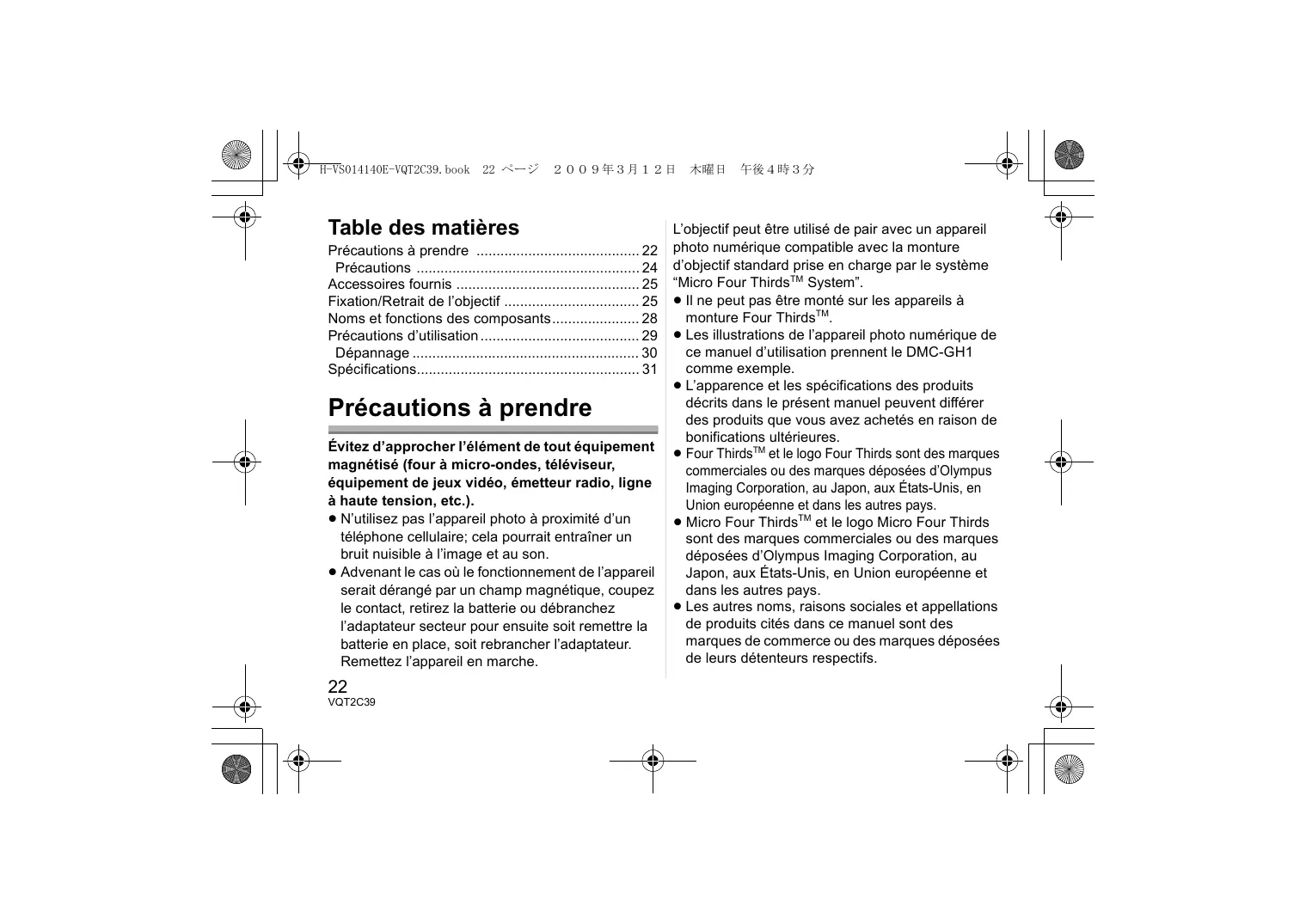 Table des matières Précautions à prendre 22 Précautions 24 Accessoires fournis 25 Fixation/Retrait de l’objectif 25 Noms et fonctions des composants 28 Précautions d’utilisation 29 Dépannage 30 Spécifications 31