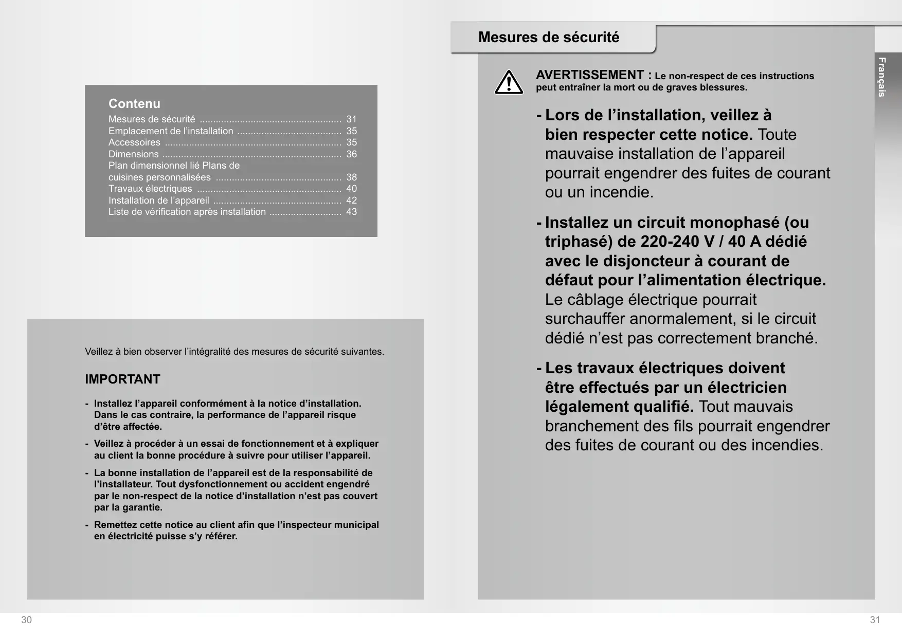 - Lors de l'installation, veilles à bien respecter cette notice. Toutemauvaise installation de l'appareil pourrait engendrer des fuites de courant ou un incendie.