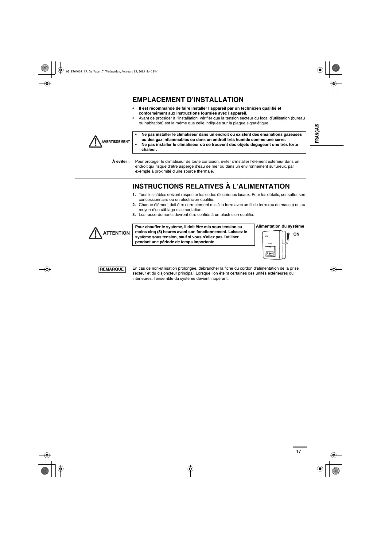 ON En cas de non-utilisation prolongée, débrancher la fiche du cordon d’alimentation de la prise secteur et du disjoncteur principal. Lorsque l’on éteint certaines des unités extérieures ou intérieures, l’ensemble du système devient inopérant.