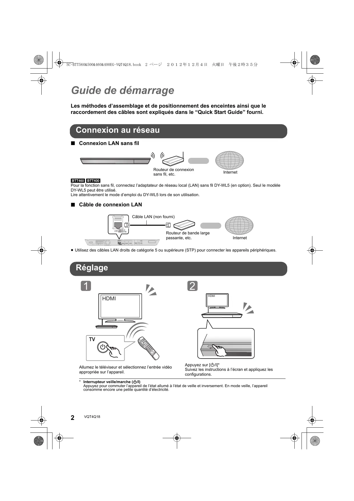 Guide de démarrage Les méthodes d’assemblage et de positionnement des enceintes ainsi que le raccordement des câbles sont expliqués dans le “Quick Start Guide” fourni. Connexion au réseau ∫ Connexion LAN sans fil Routeur de connexion sans fil, etc. Internet [BTT460] [BTT400] Pour la fonction sans fil, connectez l’adaptateur de réseau local (LAN) sans fil DY-WL5 (en option). Seul le modèle DY-WL5 peut être utilisé. Lire attentivement le mode d’emploi du DY-WL5 lors de son utilisation. ∫ Câble de connexion LAN Câble LAN (non fourni) Routeur de bande large passante, etc. Internet ≥ Utilisez des câbles LAN droits de catégorie 5 ou supérieure (STP) pour connecter les appareils périphériques. Réglage
