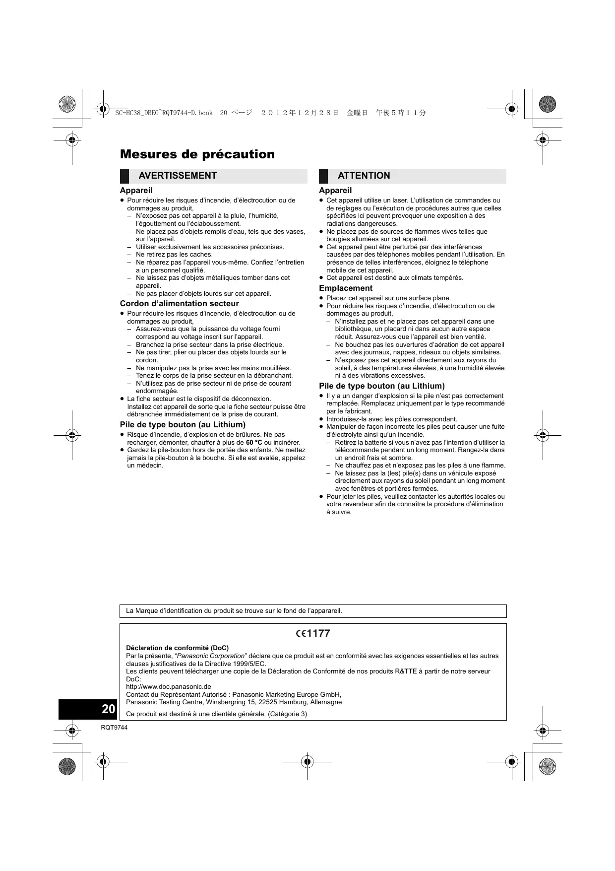 - Déclaration de conformité (DoC) Par la présente, “Panasonic Corporation” déclare que ce produit est en conformité avec les exigences essentielles et les autres clauses justificatives de la Directive 1999/5/EC. Les clients peuvent télécharger une copie de la Déclaration de Conformité de nos produits R&TTE à partir de notre serveur DoC: http://www.doc.panasonic.de Contact du Représentant Autorisé : Panasonic Marketing Europe GmbH, Panasonic Testing Centre, Winsbergring 15, 22525 Hamburg, Allemagne Ce produit est destiné à une clientèle générale. (Catégorie 3) RQT9744 2012年12月28日 Table des matières Mesures de précaution p. 20