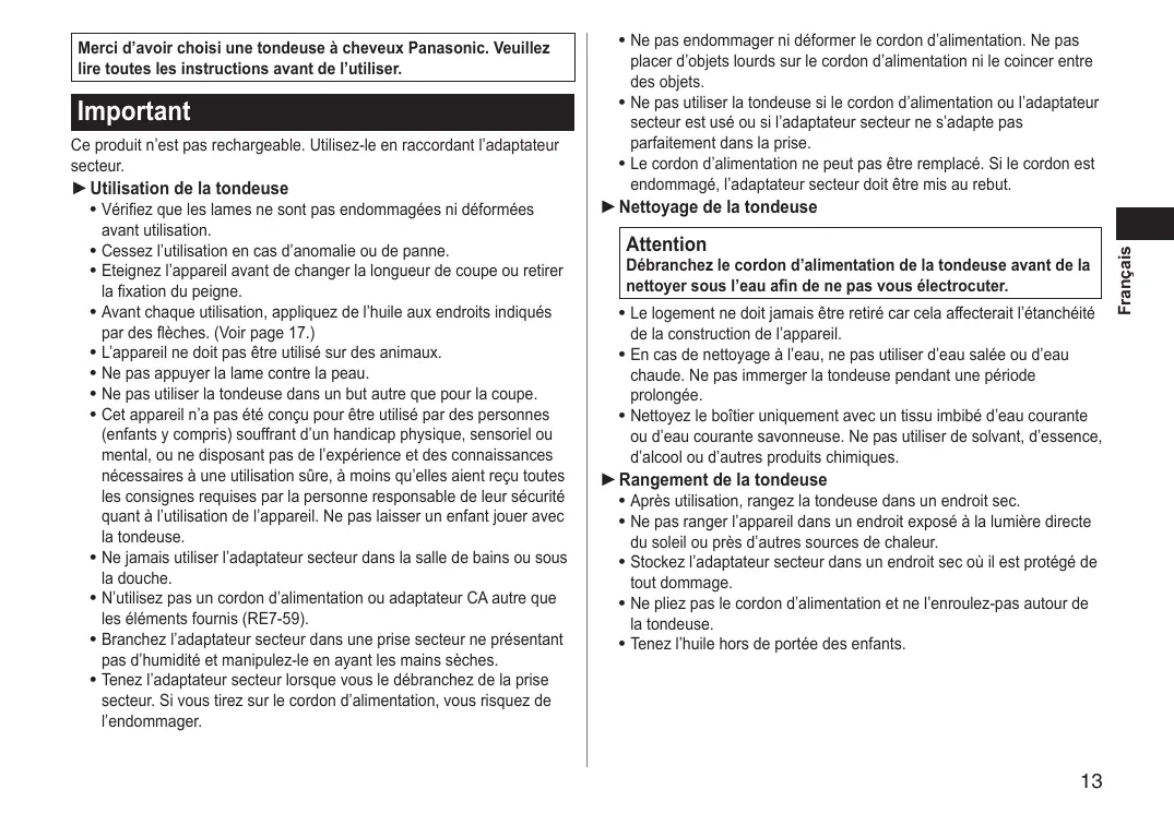- Ne pas utiliser la tondeuse si le cordon d'alimentation ou l'adaptateur secteur est usé ou si l'adaptateur secteur ne s'adapte pas parfaitement dans la prise.