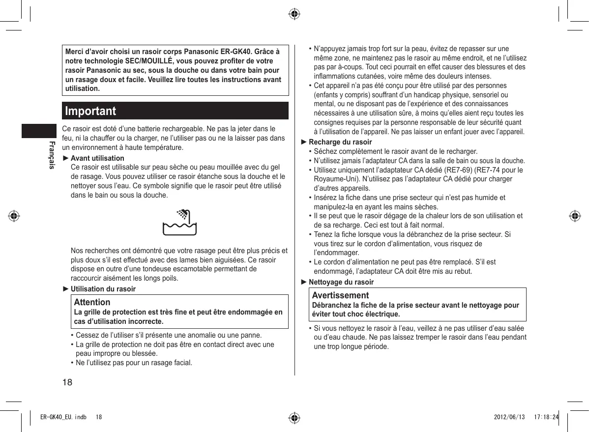 Merci d’avoir choisi un rasoir corps Panasonic ER‑GK40. Grâce à notre technologie SEC/MOUILLÉ, vous pouvez profiter de votre rasoir Panasonic au sec, sous la douche ou dans votre bain pour un rasage doux et facile. Veuillez lire toutes les instructions avant utilisation. Important Français Ce rasoir est doté d’une batterie rechargeable. Ne pas la jeter dans le feu, ni la chauffer ou la charger, ne l’utiliser pas ou ne la laisser pas dans un environnement à haute température. ► Avant utilisation Ce rasoir est utilisable sur peau sèche ou peau mouillée avec du gel de rasage. Vous pouvez utiliser ce rasoir étanche sous la douche et le nettoyer sous l’eau. Ce symbole signifie que le rasoir peut être utilisé dans le bain ou sous la douche. Nos recherches ont démontré que votre rasage peut être plus précis et plus doux s’il est effectué avec des lames bien aiguisées. Ce rasoir dispose en outre d’une tondeuse escamotable permettant de raccourcir aisément les longs poils. ► Utilisation du rasoir Attention La grille de protection est très fine et peut être endommagée en cas d’utilisation incorrecte.