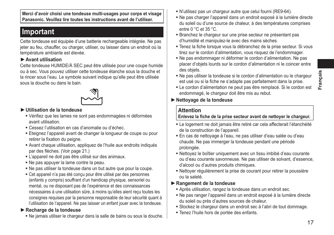 Cette tondeuse HUMIDE/À SEC peut être utilisée pour une coupe humide ou à sec. Vous pouvez utiliser cette tondeuse étanche sous la douche et la rincer sous l’eau. Le symbole suivant indique qu’elle peut être utilisée sous la douche ou dans le bain.