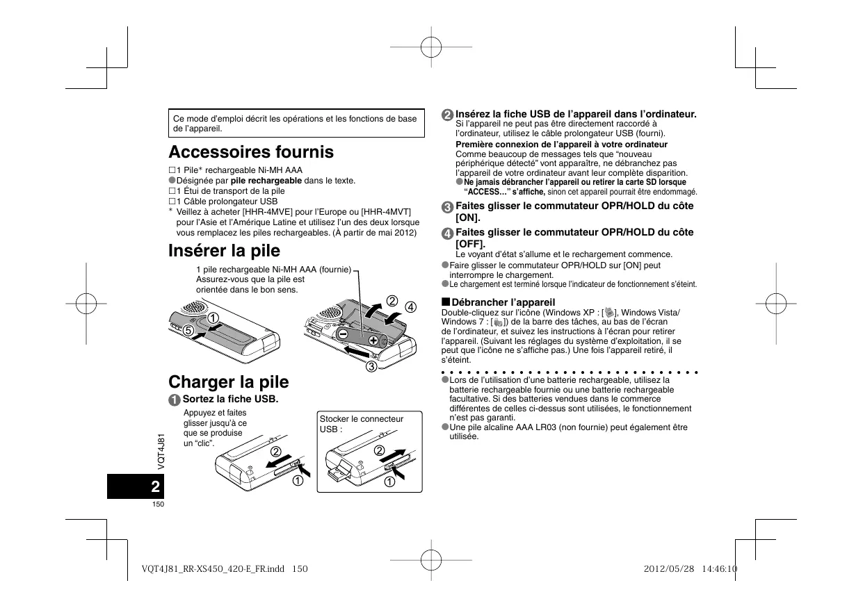 Ce mode d’emploi décrit les opérations et les fonctions de base de l’appareil. Accessoires fournis 1 Pile rechargeable Ni-MH AAA *Désignée par pile rechargeable dans le texte. 1 Étui de transport de la pile 1 Câble prolongateur USB Veillez à acheter [HHR-4MVE] pour l’Europe ou [HHR-4MVT] pour l’Asie et l’Amérique Latine et utilisez l’un des deux lorsque vous remplacez les piles rechargeables. (À partir de mai 2012) 2 Insérez la fiche USB de l’appareil dans l’ordinateur. Si l’appareil ne peut pas être directement raccordé à l’ordinateur, utilisez le câble prolongateur USB (fourni). Première connexion de l’appareil à votre ordinateur Comme beaucoup de messages tels que “nouveau périphérique détecté” vont apparaître, ne débranchez pas l’appareil de votre ordinateur avant leur complète disparition. *Ne jamais débrancher l’appareil ou retirer la carte SD lorsque “ACCESS…” s’affiche, sinon cet appareil pourrait être endommagé. 3 Faites glisser le commutateur OPR/HOLD du côte [ON]. 4 Faites glisser le commutateur OPR/HOLD du côte [OFF]. Insérer la pile 1 pile rechargeable Ni-MH AAA (fournie) Assurez-vous que la pile est orientée dans le bon sens. Le voyant d’état s’allume et le rechargement commence. *Faire glisser le commutateur OPR/HOLD sur [ON] peut interrompre le chargement. *Le chargement est terminé lorsque l’indicateur de fonctionnement s’éteint. g Débrancher l’appareil Double-cliquez sur l’icône (Windows XP : [ ], Windows Vista/ Windows 7 : [ ]) de la barre des tâches, au bas de l’écran de l’ordinateur, et suivez les instructions à l’écran pour retirer l’appareil. (Suivant les réglages du système d’exploitation, il se peut que l’icône ne s’affiche pas.) Une fois l’appareil retiré, il s’éteint. 1 Sortez la fiche USB. Appuyez et faites glisser jusqu’à ce que se produise un “clic”. Stocker le connecteur USB : *Lors de l’utilisation d’une batterie rechargeable, utilisez la batterie rechargeable fournie ou une batterie rechargeable facultative. Si des batteries vendues dans le commerce différentes de celles ci-dessus sont utilisées, le fonctionnement n’est pas garanti. *Une pile alcaline AAA LR03 (non fournie) peut également être utilisée.