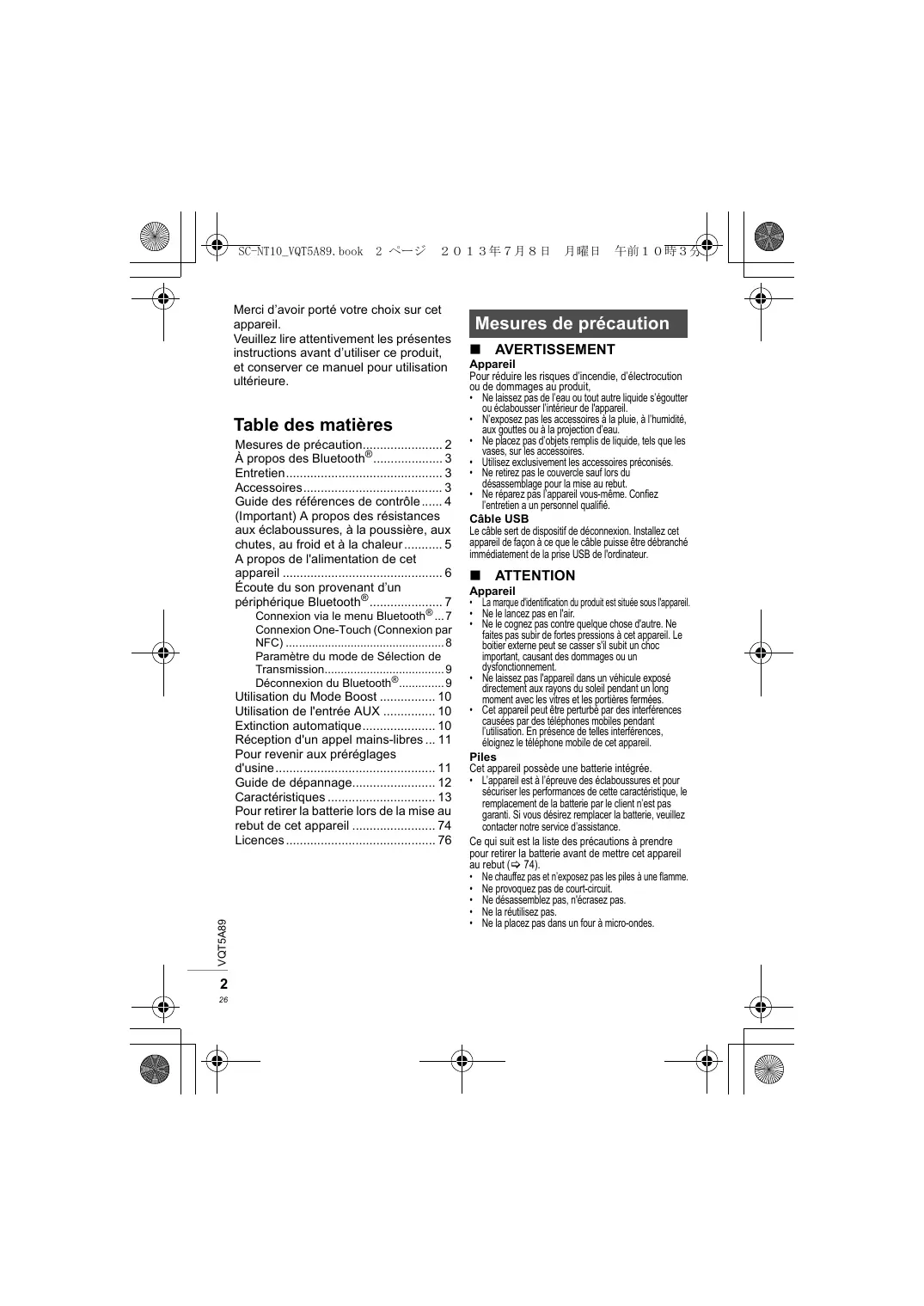 - Le nom et la marque Bluetooth® ainsi que les logos sont la propriété de Bluetooth SIG, Inc. et toute utilisation de ces marques par Panasonic Corporation est effectuée sous licence. Les autres marques et noms commerciaux appartiennent à leurs propriétaires respectifs. L’élimination des équipements et des batteries usagés Applicable uniquement dans les pays membres de l’Union européenne et les pays disposant de systèmes de recyclage. Apposé sur le produit lui-même, sur son emballage, ou figurant dans la documentation qui l’accompagne, ce pictogramme indique que les piles, appareils électriques et électroniques usagés, doivent être séparées des ordures ménagères. Afin de permettre le traitement, la valorisation et le recyclage adéquats des piles et des appareils usagés, veuillez les porter à l’un des points de collecte prévus, conformément à la législation nationale en vigueur. En les éliminant conformément à la réglementation en vigueur, vous contribuez à éviter le gaspillage de ressources précieuses ainsi qu’à protéger la santé humaine et l’environnement. Pour de plus amples renseignements sur la collecte et le recyclage, veuillez vous renseigner auprès des collectivités locales. Le non-respect de la réglementation relative à l’élimination des déchets est passible d’une peine d’amende. VQT5A89 Note relative au pictogramme à apposer sur les piles (pictogramme du bas): Si ce pictogramme est combiné avec un symbole chimique, il répond également aux exigences posées par la Directive relative au produit chimique concerné.