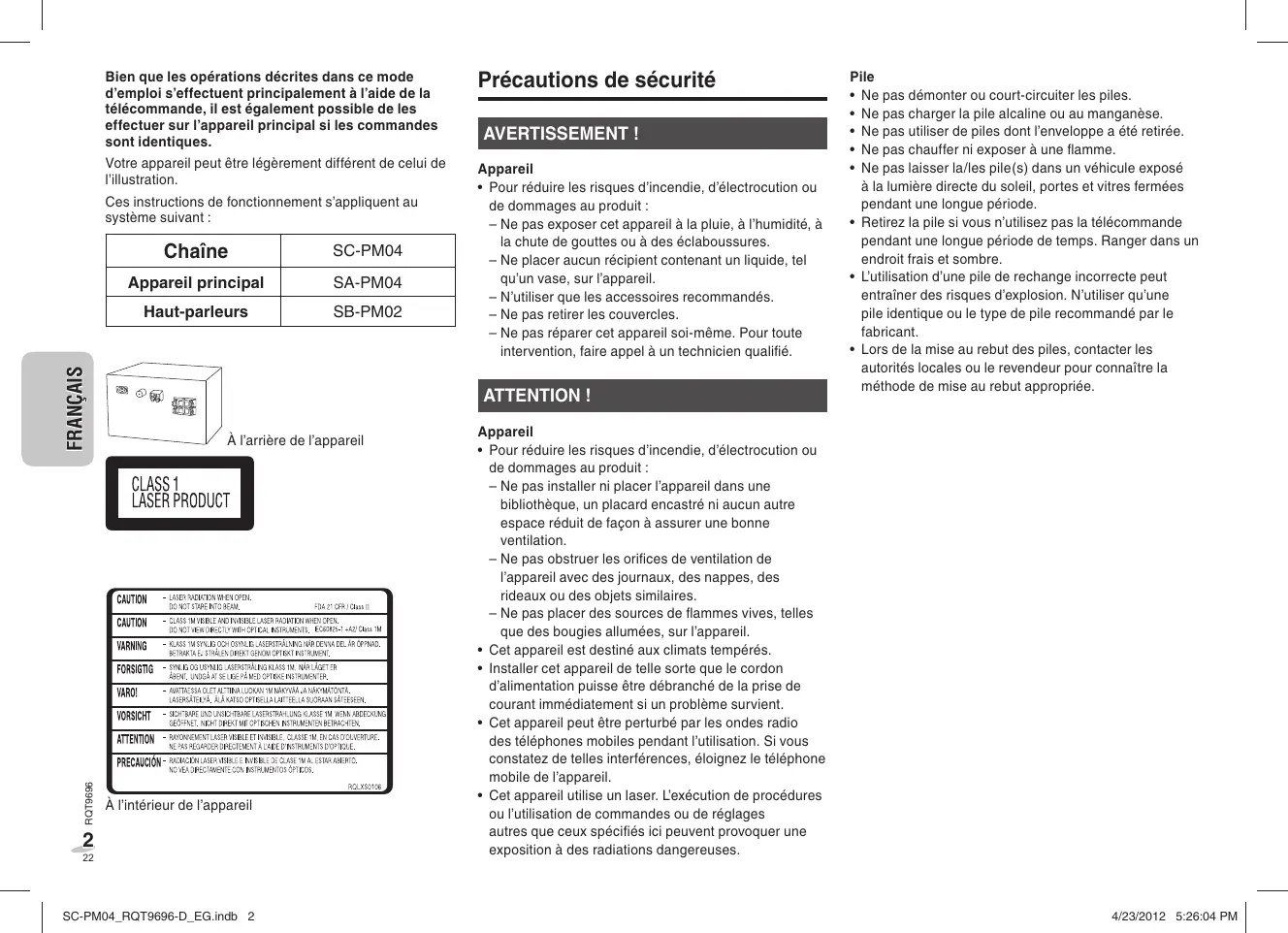 - Pour réduire les risques d’incendie, d’électrocution ou de dommages au produit : – Ne pas exposer cet appareil à la pluie, à l’humidité, à la chute de gouttes ou à des éclaboussures. – Ne placer aucun récipient contenant un liquide, tel qu’un vase, sur l’appareil. – N’utiliser que les accessoires recommandés. – Ne pas retirer les couvercles. – Ne pas réparer cet appareil soi-même. Pour toute intervention, faire appel à un technicien qualifié. RQT9696 FRANÇAIS Ces instructions de fonctionnement s’appliquent au système suivant : Chaîne SC-PM04 Appareil principal SA-PM04 Haut-parleurs SB-PM02 AVERTISSEMENT ! ATTENTION ! À l’arrière de l’appareil À l’intérieur de l’appareil