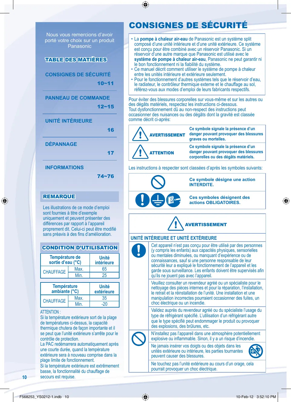 CONSIGNES DE SÉCURITÉ Nous vous remercions d’avoir porté votre choix sur un produit Panasonic TABLE DES MATIÈRES CONSIGNES DE SÉCURITÉ 10~11 PANNEAU DE COMMANDE 12~15 UNITÉ INTÉRIEURE