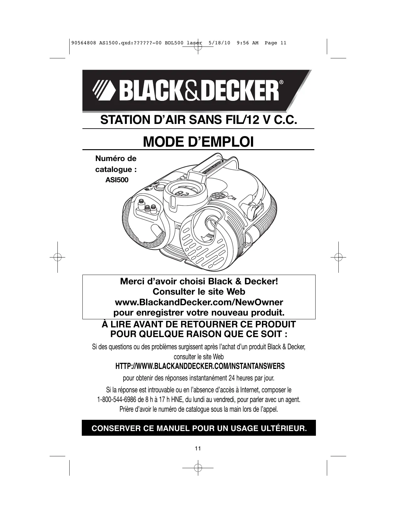Numéro de catalogue : ASI500 Merci d’avoir choisi Black & Decker! Consulter le site Web www.BlackandDecker.com/NewOwner pour enregistrer votre nouveau produit.
