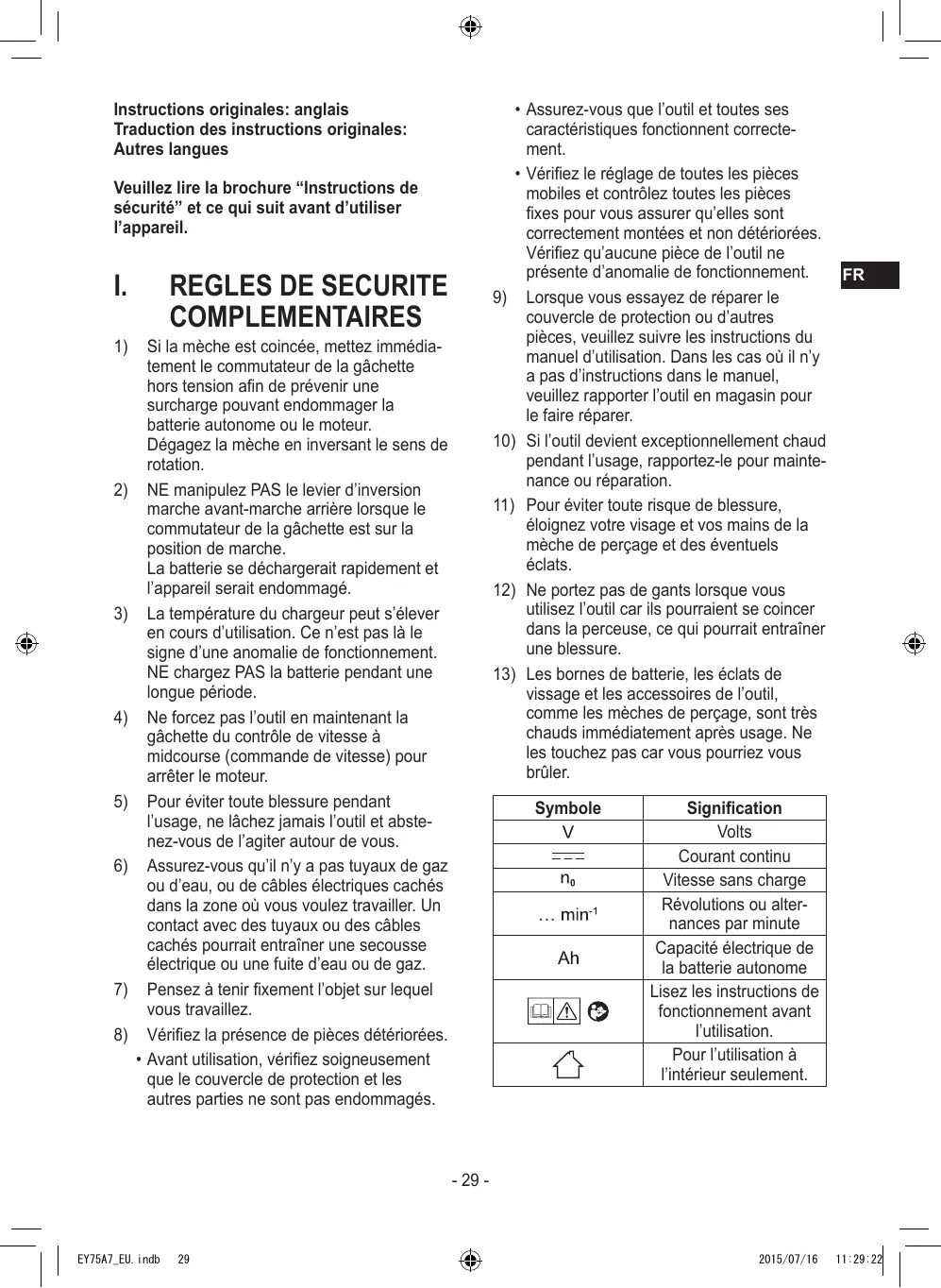 - • Avant utilisation, vérifiez soigneusement que le couvercle de protection et les autres parties ne sont pas endommagés. Symbole Signification Volts Courant continu Vitesse sans charge Révolutions ou alternances par minute Capacité électrique de la batterie autonome Lisez les instructions de fonctionnement avant l’utilisation. Pour l’utilisation à l’intérieur seulement.