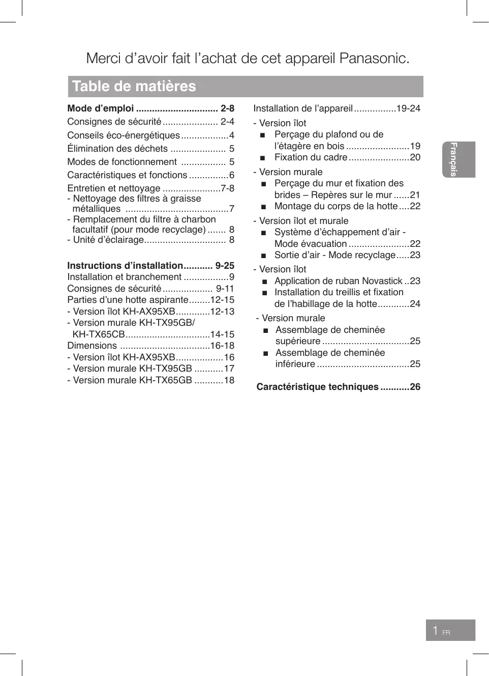 KHAX95XB - Hotte aspirante PANASONIC - Notice d'utilisation et mode d'emploi gratuit