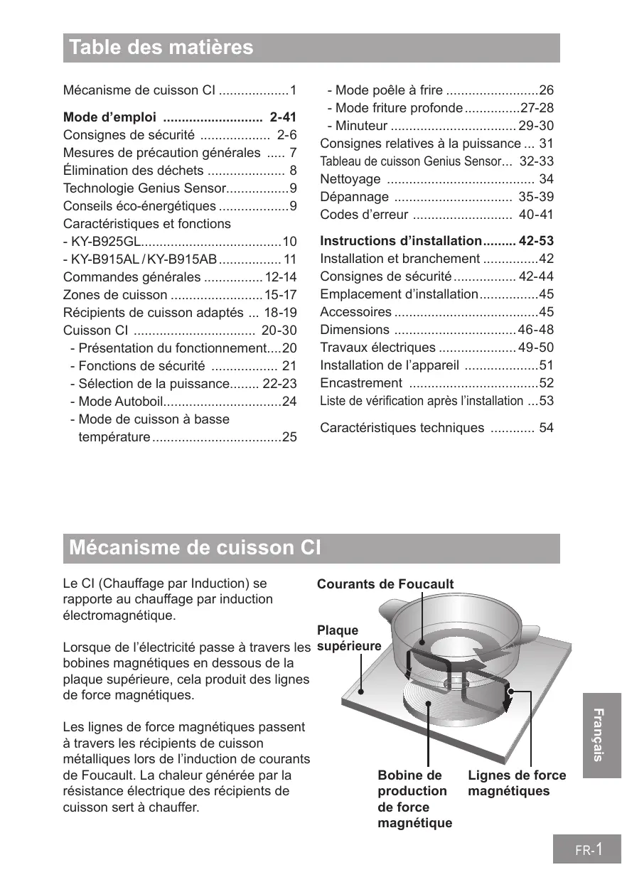 - Caractéristiques techniques English Mécanisme de cuisson CI Le CI (Chauffage par Induction) se rapporte au chauffage par induction électromagnétique. Courants de Foucault Plaque Lorsque de l’électricité passe à travers les supérieure bobines magnétiques en dessous de la plaque supérieure, cela produit des lignes de force magnétiques. Français Les lignes de force magnétiques passent à travers les récipients de cuisson métalliques lors de l’induction de courants de Foucault. La chaleur générée par la résistance électrique des récipients de cuisson sert à chauffer. Bobine de production de force magnétique Lignes de force magnétiques FR- 1 Mode d’emploi Consignes de sécurité ■■ Cet appareil peut être utilisé par des enfants âgés de 8 ans et plus et par des personnes de capacités physiques, sensorielles ou mentales réduites, ou manquant d’expérience ou de connaissances, à condition de bénéficier de la supervision ou d’instructions concernant l’utilisation de l’appareil en toute sécurité et de comprendre les risques encourus. Ne laissez pas d’enfants jouer avec l’appareil. Le nettoyage et l’entretien ne doivent pas être effectués par des enfants sans supervision. ■■ Ne placez pas de matériaux combustibles près de l’appareil. Ils risquent de provoquer un incendie. ■■ Ne surchauffez pas le récipient lors du préchauffage pour faire rissoler des aliments. ■■ AVERTISSEMENT : En cas de dysfonctionnement ou de panne, cessez immédiatement d’utiliser l’appareil. Eteignez l’interrupteur d’alimentation principale et le coupe-circuit, puis contactez le centre de dépannage. Vous risquez autrement d’être exposé à la fumée, aux brûlures et aux décharges électriques. FR- 2 Consignes de sécurité ■■ Si le cordon d’alimentation est endommagé, il doit être remplacé par un technicien d’entretien autorisé par le fabricant afin d’éviter tout risque. ■■ Mélangez les liquides avant de les chauffer. Sinon, les liquides risquent d’éclabousser et de provoquer des brûlures ou des blessures. ■■ N’appliquez pas de pression excessive et ne faites pas tomber d’objets sur la plaque supérieure. Cela risque de fissurer ou d’endommager la plaque supérieure. ■■ Ne placez pas de chalumeau, de cylindre en acier ni de conserve sur ou près de l’appareil. Ils risquent d’exploser sous l’effet de la chaleur. English ■■ Les objets métalliques comme les couteaux, les fourchettes, les cuillers et les couvercles ne doivent pas être placés sur la surface de la plaque, au risque de chauffer. ■■ Après utilisation, éteignez la résistance de plaque via sa commande et ne vous appuyez pas sur le détecteur de récipient. Français ■■ Ne pas démonter, réparer ni modifier l’appareil. Pour les réparations, contactez le revendeur auprès de qui vous avez acheté l’appareil. FR- 3 Consignes de sécurité ■■ AVERTISSEMENT : cet appareil doit être mis à la terre pour éviter tout risque de décharge électrique ou d’incendie. ■■ AVERTISSEMENT : l’appareil et ses pièces accessibles peuvent chauffer lors de l’utilisation. Prenez soin de ne pas toucher les résistances de chauffage. Les enfants âgés de moins de 8 ans doivent être tenus à l’écart, à moins d’être constamment sous surveillance. ■■ AVERTISSEMENT : toute cuisson laissée sans surveillance sur une plaque avec de la matière grasse ou de l’huile peut s’avérer dangereuse et provoquer un incendie. N’essayez JAMAIS d’éteindre un incendie avec de l’eau, mais éteignez l’appareil, puis couvrez les flammes avec un couvercle ou une couverture anti-feu. ■■ AVERTISSEMENT : Risque d’incendie : ne rangez jamais d’objets sur les surfaces de cuisson. ■■ AVERTISSEMENT : si la surface est fissurée, éteignez l’appareil pour éviter tout risque de décharge électrique. ■■ AVERTISSEMENT : les protections de plaque ne sont pas compatibles avec cet appareil et ne doivent en aucun cas être équipées. FR- 4 Consignes de sécurité ■■ Si l’huile produit de la fumée, éteignez immédiatement l’interrupteur d’alimentation principale. Cela risque autrement de provoquer un incendie. ■■ Manipulez l’huile chaude avec précaution car elle risque de provoquer des brûlures. ■■ Faites attention en préchauffant le récipient avec de petites quantités d’huile. Le récipient risque de surchauffer et d’entraîner des dégâts. ■■ Ne chauffez pas de récipient de cuisson vide et ne surchauffez pas les ingrédients. Vous risquez de brûler les ingrédients et d’endommager le récipient de cuisson. ■■ N’utilisez pas de nettoyeur à vapeur. L’eau risque de s’infiltrer dans les composants électriques et de provoquer des dégâts. Français ■■ Si vous portez un dispositif médical (comme un défibrillateur), consultez votre médecin. Le fonctionnement de l’appareil peut affecter un dispositif médical. English ■■ N’utilisez pas l’appareil à d’autres fins que la cuisson. Cela risque d’entraîner une surchauffe ou un dysfonctionnement susceptible de déclencher un incendie. FR- 5 Consignes de sécurité ■■ L’appareil n’est pas destiné à fonctionner au moyen d’un minuteur externe ou d’une télécommande séparée. ■■ Ne placez pas de papier ni de torchons sous les récipients de cuisson. Ils risquent de roussir à cause de la chaleur du récipient. ■■ AVERTISSEMENT : le fabricant ne peut être tenu responsable des dommages occasionnés aux personnes ou aux objets dus au manquement des consignes ci-dessus, à la manipulation de toute partie de l’appareil ou à l’utilisation de pièces détachées n’étant pas d’origine. FR- 6 Mesures de précaution générales ■■ L’appareil produit des lignes de force magnétiques. Ne placez rien de sensible au magnétisme à proximité de l’appareil. -- Les lecteurs r