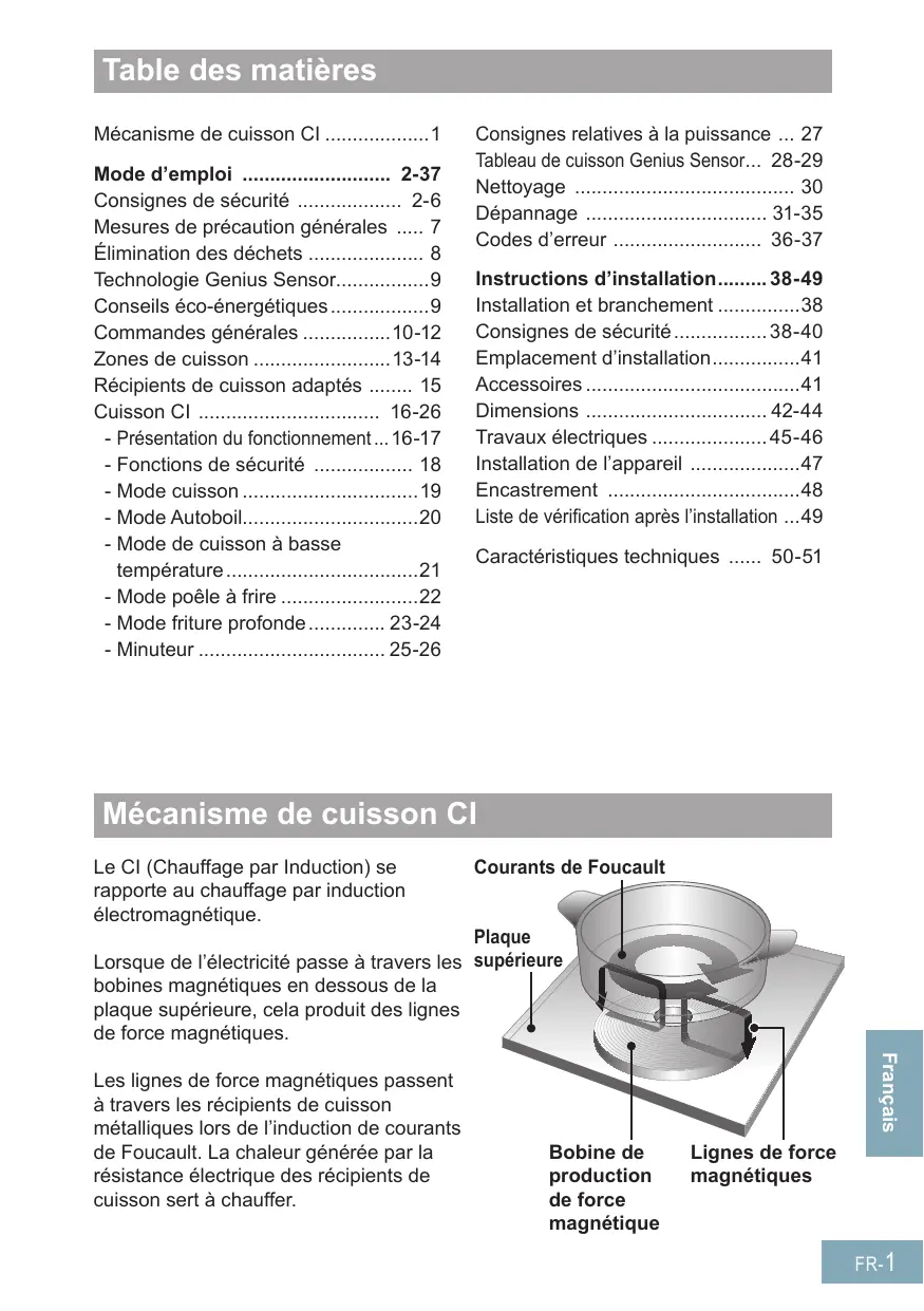 - Caractéristiques techniques -51 English Mécanisme de cuisson CI Le CI (Chauffage par Induction) se rapporte au chauffage par induction électromagnétique. Courants de Foucault Plaque Lorsque de l’électricité passe à travers les supérieure bobines magnétiques en dessous de la plaque supérieure, cela produit des lignes de force magnétiques. Français Les lignes de force magnétiques passent à travers les récipients de cuisson métalliques lors de l’induction de courants de Foucault. La chaleur générée par la résistance électrique des récipients de cuisson sert à chauffer. Bobine de production de force magnétique Lignes de force magnétiques FR- 1 Mode d’emploi Consignes de sécurité ■■ Cet appareil peut être utilisé par des enfants âgés de 8 ans et plus et par des personnes de capacités physiques, sensorielles ou mentales réduites, ou manquant d’expérience ou de connaissances, à condition de bénéficier de la supervision ou d’instructions concernant l’utilisation de l’appareil en toute sécurité et de comprendre les risques encourus. Ne laissez pas d’enfants jouer avec l’appareil. Le nettoyage et l’entretien ne doivent pas être effectués par des enfants sans supervision. ■■ Ne placez pas de matériaux combustibles près de l’appareil. Ils risquent de provoquer un incendie. ■■ Ne surchauffez pas le récipient lors du préchauffage pour faire rissoler des aliments. ■■ AVERTISSEMENT : En cas de dysfonctionnement ou de panne, cessez immédiatement d’utiliser l’appareil. Eteignez l’interrupteur d’alimentation principale et le coupe-circuit, puis contactez le centre de dépannage. Vous risquez autrement d’être exposé à la fumée, aux brûlures et aux décharges électriques. FR- 2 Consignes de sécurité ■■ Si le cordon d’alimentation est endommagé, il doit être remplacé par un technicien d’entretien autorisé par le fabricant afin d’éviter tout risque. ■■ Mélangez les liquides avant de les chauffer. Sinon, les liquides risquent d’éclabousser et de provoquer des brûlures ou des blessures. ■■ N’appliquez pas de pression excessive et ne faites pas tomber d’objets sur la plaque supérieure. Cela risque de fissurer ou d’endommager la plaque supérieure. ■■ Ne placez pas de chalumeau, de cylindre en acier ni de conserve sur ou près de l’appareil. Ils risquent d’exploser sous l’effet de la chaleur. English ■■ Les objets métalliques comme les couteaux, les fourchettes, les cuillers et les couvercles ne doivent pas être placés sur la surface de la plaque, au risque de chauffer. ■■ Après utilisation, éteignez la résistance de plaque via sa commande et ne vous appuyez pas sur le détecteur de récipient. Français ■■ Ne pas démonter, réparer ni modifier l’appareil. Pour les réparations, contactez le revendeur auprès de qui vous avez acheté l’appareil. FR- 3 Consignes de sécurité ■■ AVERTISSEMENT : cet appareil doit être mis à la terre pour éviter tout risque de décharge électrique ou d’incendie. ■■ AVERTISSEMENT : l’appareil et ses pièces accessibles peuvent chauffer lors de l’utilisation. Prenez soin de ne pas toucher les résistances de chauffage. Les enfants âgés de moins de 8 ans doivent être tenus à l’écart, à moins d’être constamment sous surveillance. ■■ AVERTISSEMENT : toute cuisson laissée sans surveillance sur une plaque avec de la matière grasse ou de l’huile peut s’avérer dangereuse et provoquer un incendie. N’essayez JAMAIS d’éteindre un incendie avec de l’eau, mais éteignez l’appareil, puis couvrez les flammes avec un couvercle ou une couverture anti-feu. ■■ AVERTISSEMENT : Risque d’incendie : ne rangez jamais d’objets sur les surfaces de cuisson. ■■ AVERTISSEMENT : si la surface est fissurée, éteignez l’appareil pour éviter tout risque de décharge électrique. ■■ AVERTISSEMENT : les protections de plaque ne sont pas compatibles avec cet appareil et ne doivent en aucun cas être équipées. FR- 4 Consignes de sécurité ■■ Si l’huile produit de la fumée, éteignez immédiatement l’interrupteur d’alimentation principale. Cela risque autrement de provoquer un incendie. ■■ Manipulez l’huile chaude avec précaution car elle risque de provoquer des brûlures. ■■ Faites attention en préchauffant le récipient avec de petites quantités d’huile. Le récipient risque de surchauffer et d’entraîner des dégâts. ■■ Ne chauffez pas de récipient de cuisson vide et ne surchauffez pas les ingrédients. Vous risquez de brûler les ingrédients et d’endommager le récipient de cuisson. ■■ N’utilisez pas de nettoyeur à vapeur. L’eau risque de s’infiltrer dans les composants électriques et de provoquer des dégâts. Français ■■ Si vous portez un dispositif médical (comme un défibrillateur), consultez votre médecin. Le fonctionnement de l’appareil peut affecter un dispositif médical. English ■■ N’utilisez pas l’appareil à d’autres fins que la cuisson. Cela risque d’entraîner une surchauffe ou un dysfonctionnement susceptible de déclencher un incendie. FR- 5 Consignes de sécurité ■■ L’appareil n’est pas destiné à fonctionner au moyen d’un minuteur externe ou d’une télécommande séparée. ■■ Ne placez pas de papier ni de torchons sous les récipients de cuisson. Ils risquent de roussir à cause de la chaleur du récipient. ■■ AVERTISSEMENT : le fabricant ne peut être tenu responsable des dommages occasionnés aux personnes ou aux objets dus au manquement des consignes ci-dessus, à la manipulation de toute partie de l’appareil ou à l’utilisation de pièces détachées n’étant pas d’origine. FR- 6 Mesures de précaution générales ■■ L’appareil produit des lignes de force magnétiques. Ne placez rien de sensible au magnétisme à proximité de l’appareil. -- Les lecteu