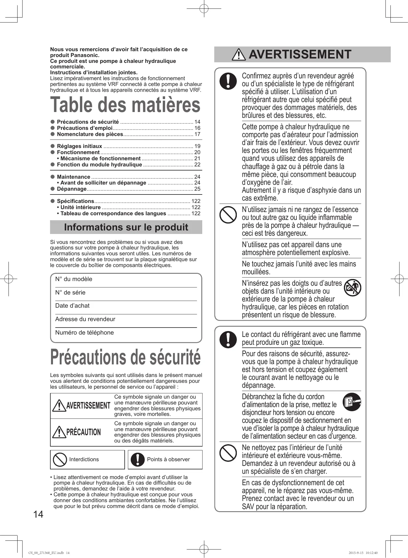 - Avant d’utiliser l’appareil, lisez ce mode d’emploi dans son intégralité et conservez-le pour toute référence ultérieure. 20:30(THU) (THU) 20:30 20:30 (THU) Hour : Min 20 : 30 Month 20:30(THU) (THU) 20:30 20:30 (THU) 2 Select Menu Nous vous remercions d’avoir fait l’acquisition de ce produit Panasonic. Ce produit est une pompe à chaleur hydraulique commerciale. Instructions d’installation jointes. Lisez impérativement les instructions de fonctionnement pertinentes au système VRF connecté à cette pompe à chaleur hydraulique et à tous les appareils connectés au système VRF. Table des matières Précautions de sécurité p. 14