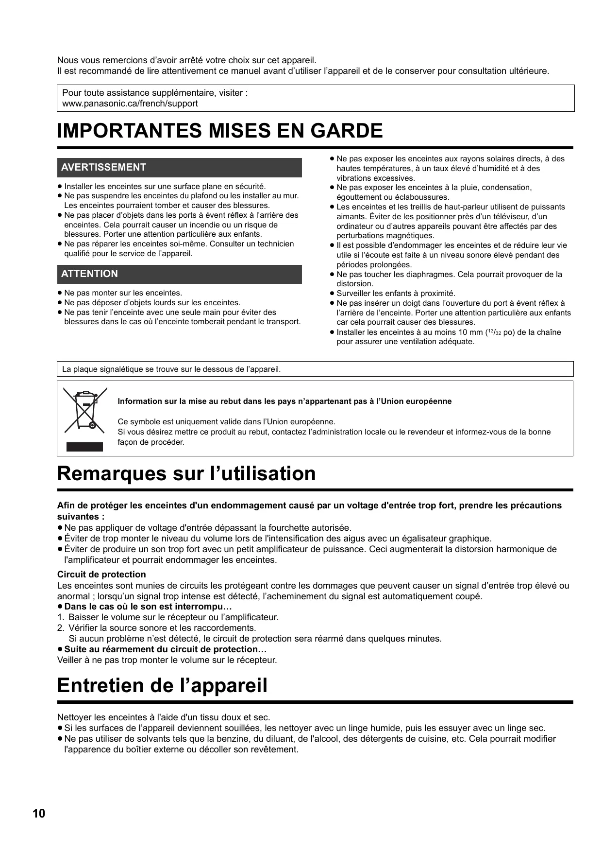 Si aucun problème n’est détecté, le circuit de protection sera réarmé dans quelques minutes. ≥ Suite au réarmement du circuit de protection… Veiller à ne pas trop monter le volume sur le récepteur. Entretien de l’appareil Nettoyer les enceintes à l'aide d'un tissu doux et sec. ≥ Si les surfaces de l’appareil deviennent souillées, les nettoyer avec un linge humide, puis les essuyer avec un linge sec. ≥ Ne pas utiliser de solvants tels que la benzine, du diluant, de l'alcool, des détergents de cuisine, etc. Cela pourrait modifier l'apparence du boîtier externe ou décoller son revêtement.