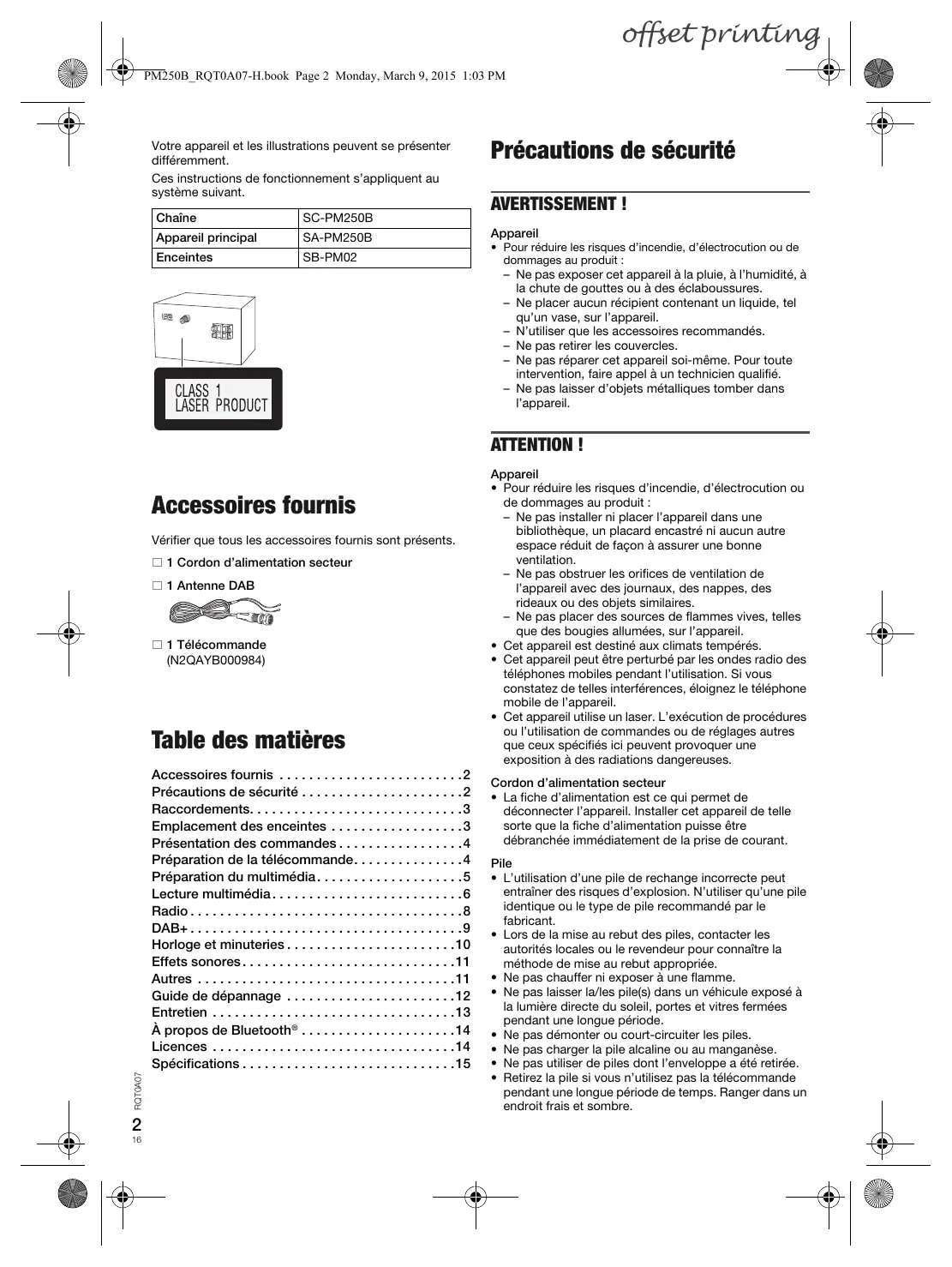 offset printing PM250B_RQT0A07-H.book Page 2 Monday, March 9, 2015 1:03 PM Votre appareil et les illustrations peuvent se présenter différemment. Ces instructions de fonctionnement s’appliquent au système suivant. Chaîne SC-PM250B Appareil principal SA-PM250B Enceintes SB-PM02 Précautions de sécurité AVERTISSEMENT ! Appareil