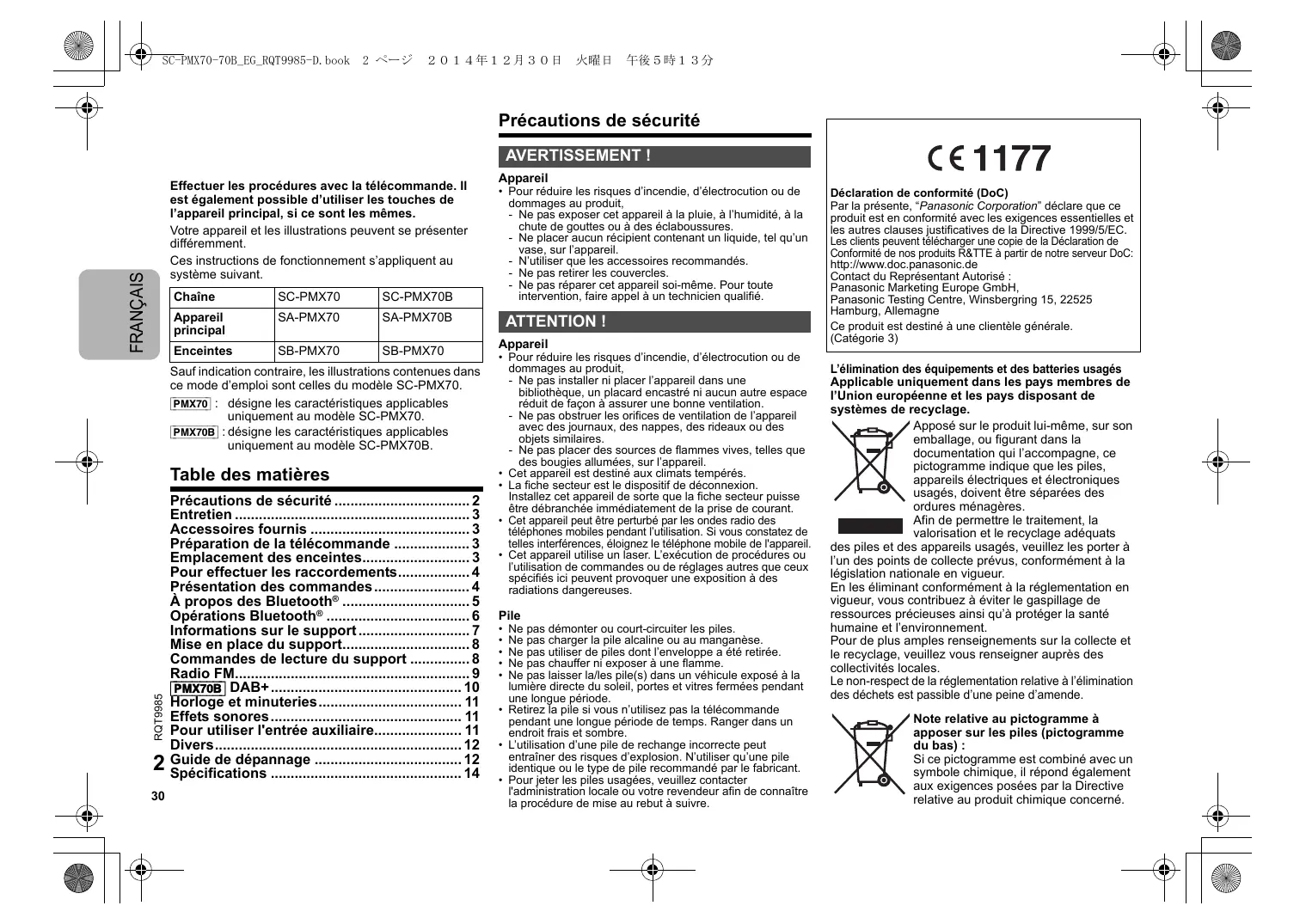 - Pour jeter les piles usagées, veuillez contacter l'administration locale ou votre revendeur afin de connaître la procédure de mise au rebut à suivre. Déclaration de conformité (DoC) Par la présente, “Panasonic Corporation” déclare que ce produit est en conformité avec les exigences essentielles et les autres clauses justificatives de la Directive 1999/5/EC. Les clients peuvent télécharger une copie de la Déclaration de Conformité de nos produits R&TTE à partir de notre serveur DoC: http://www.doc.panasonic.de Contact du Représentant Autorisé : Panasonic Marketing Europe GmbH, Panasonic Testing Centre, Winsbergring 15, 22525 Hamburg, Allemagne Ce produit est destiné à une clientèle générale. (Catégorie 3) L’élimination des équipements et des batteries usagés Applicable uniquement dans les pays membres de l’Union européenne et les pays disposant de systèmes de recyclage. Apposé sur le produit lui-même, sur son emballage, ou figurant dans la documentation qui l’accompagne, ce pictogramme indique que les piles, appareils électriques et électroniques usagés, doivent être séparées des ordures ménagères. Afin de permettre le traitement, la valorisation et le recyclage adéquats des piles et des appareils usagés, veuillez les porter à l’un des points de collecte prévus, conformément à la législation nationale en vigueur. En les éliminant conformément à la réglementation en vigueur, vous contribuez à éviter le gaspillage de ressources précieuses ainsi qu’à protéger la santé humaine et l’environnement. Pour de plus amples renseignements sur la collecte et le recyclage, veuillez vous renseigner auprès des collectivités locales. Le non-respect de la réglementation relative à l’élimination des déchets est passible d’une peine d’amende. Note relative au pictogramme à apposer sur les piles (pictogramme du bas) : Si ce pictogramme est combiné avec un symbole chimique, il répond également aux exigences posées par la Directive relative au produit chimique concerné. SC-PMX70-70B_EG_RQT9985-D.book 3 ページ 2014年12月30日 Technologie d’encodage du son MPEG Layer-3 brevetée par Fraunhofer IIS et Thomson. Le nom et la marque Bluetooth® ainsi que les logos sont des marques déposées appartenant à Bluetooth SIG, Inc. et toute utilisation de ces marques par Panasonic Corporation est effectuée sous licence. Les autres marques et noms commerciaux appartiennent à leurs propriétaires respectifs.
